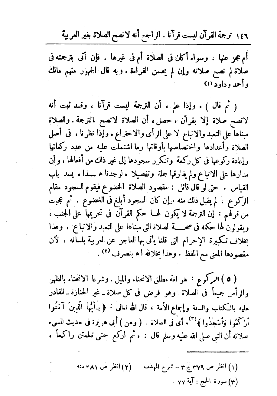 وبه قال الجمهور منهم مالك وأحمد وداود (¬1) (ثم قال) " وإذا علم " أنّ الترجمة ليست قرآنا، وقد ثبت أنه لا تصح صلاة إلا بقرآن " حصل " أنّ الصلاة لا تصح بالترجمة. والصلاة مبناها على التعبد والاتباع لا على الرأى والاختراع " وإذا نظرنا " فى أصل الصلاة أعدادها واختصاصها بأوقاتها وما اشتملت عليه من عدد ركعاتها وإعادة ركوعها فى كل ركعة وتكرر سجودها إلى غير ذلك من أفعالها، وأن مدارها على الاتباع ولم يفارقها جملة وتفصيلا " لوجدنا هذا " يسدّ باب القياس. حتى لو قال قائل: مقصود الصلاة الخضوع فيقوم السجود مقام الركوع، لم يقبل ذلك منه وإن كان السجود أبلغ فى الخضوع. ثم عجبت من قولهم: إن الترجمة لا يكون لها حكم القرآن فى تحريمها على الجنب، ويقولون لها حكمه فى صحة الصلاة التى مبناها على التعبد والاتباع، وهذا بخلاف تكبيرة الإحرام التى قلنا يأتى بها العاجز عن العربية بلسانه، لأن مقصودها المعنى مع اللفظ. وهذا بخلافه أهـ بتصرف (¬2).