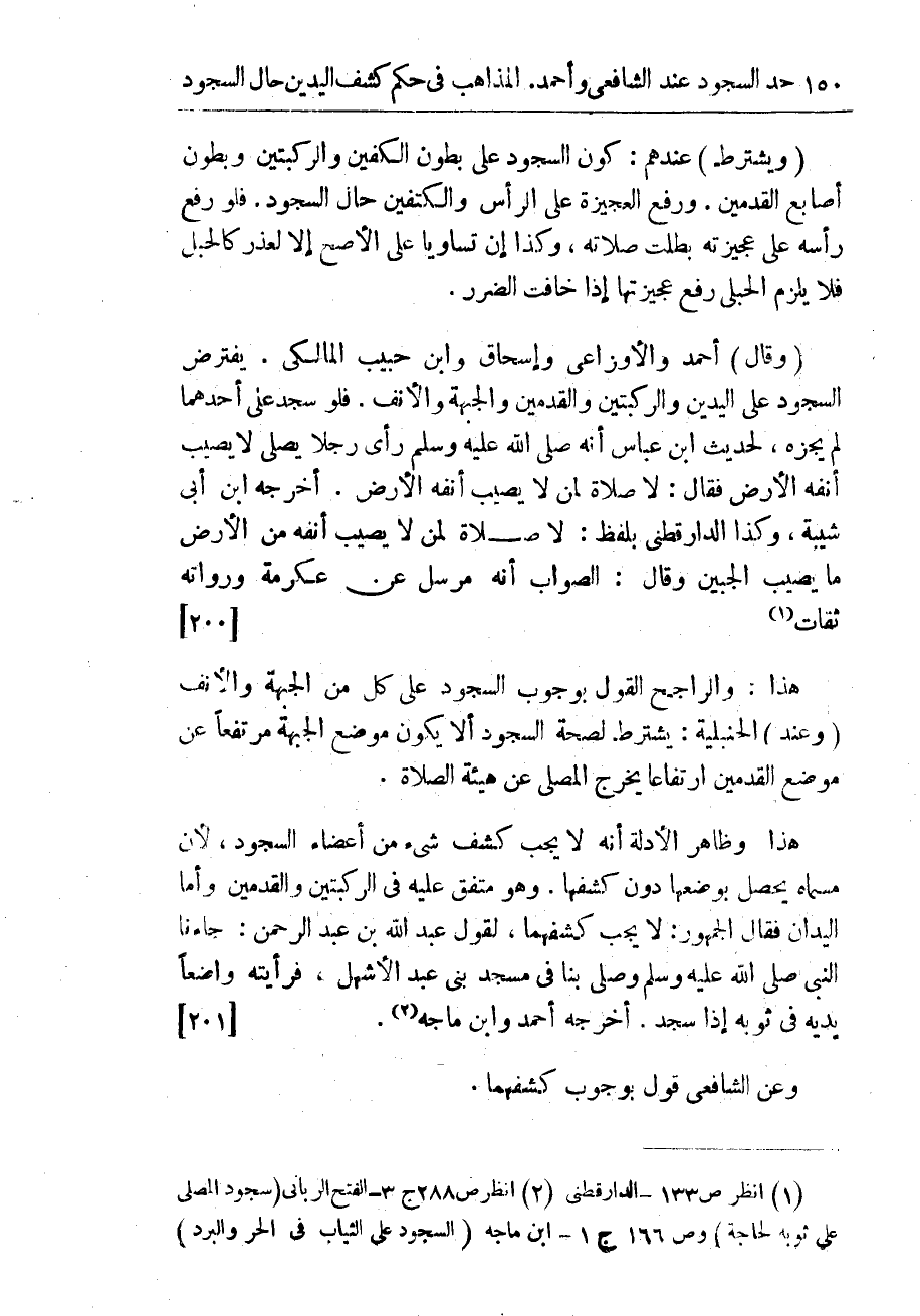 هذا. وظاهر الأدلة أنه لا يجب كشف شئ من أعضاء السجود، لأنّ مسماه يحصل بوضعها دون كشفها. وهو متفق عليه فى الركبتين والقدمين وأما اليدان فقال الجمهور لا يجب كشفهما، لقول عبد الله بن عبد الرحمن: جاءنا النبىُّ صلى الله عليه وسلم وصّى بنا فى مسجد بنى عبِد الأشْهِل، فرأيتُه واضعاً يدَيه فى ثوبه إذا سجد. أخرجه أحمد وابن ماجه (¬2) {201}
