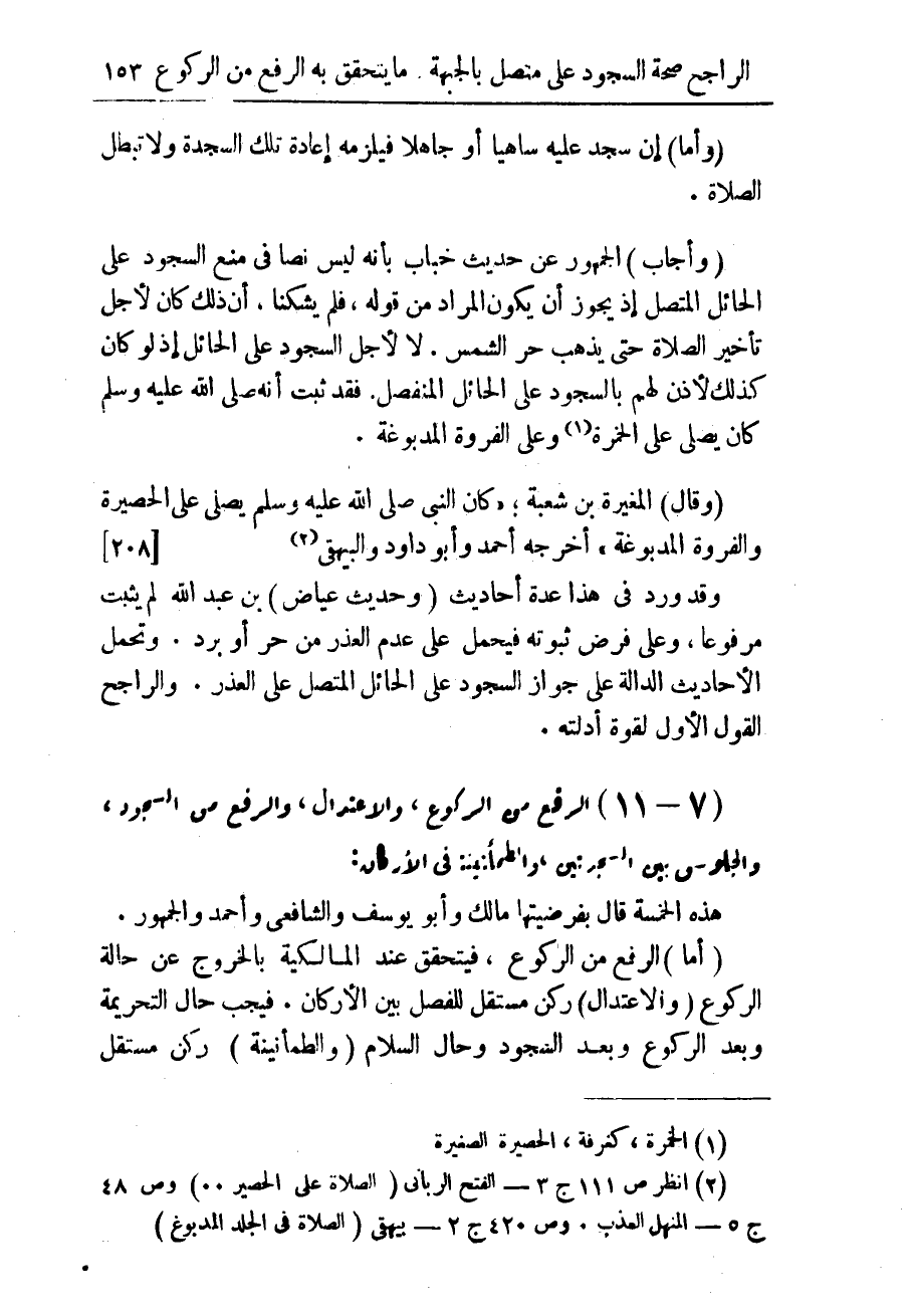 (وأما) إن سجد عليه ساهيا أو جاهلا فيلزمه إعادة تلك السجدة ولا تبطل الصلاة (وأجاب) الجمهور عن حديث خباب بأنه ليس نصا فى منع السجود على الحائل المتصل إذا يجوز أن يكون المراد فى قوله، فلم يُشْكِنا، أن ذلك كان لأجل تأخير الصلاة حتى يذهب حرّ الشمس، لا لأجل السجود على الحائل إذ لو كان كذلك، لأذن لهم بالسجود على الحائل المنفصل، فقد ثبت أنه صلى الله عليه وسلم كان يصلى على الخُمرة (¬1) وعلى الفَرُوة المدبوغة.