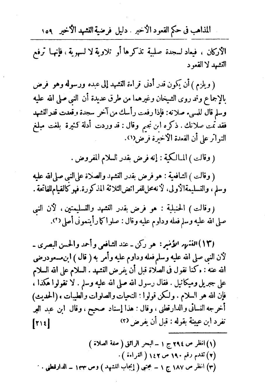 (13) التشهد الأخير: هو ركن - عند الشافعى وأحمد والحسن البصرى - لأن النبى صلى الله عليه وسلم فعله وداوم عليه وأمر به (قال) ابن مسعود رضى الله عنه: " كنا نقول فى الصلاة قبل أن يُفْرضَ التشهدُ: السلام على الله السلام على جبريل وميكائيل. فقال رسول الله صلى الله عليه وسلم: لا تقولوا هكذا، فإن اللهَ هو السلامُ، ولكنْ قولوا: " التحيات والصلوات والطيبات " أخرجه النسائى والدار قطنى. وقال: هذا إسناد صحيح. وقال ابن عبد البر تفرد ابن عيينة بقوله: قبل أن يفرض (¬3) {214}
