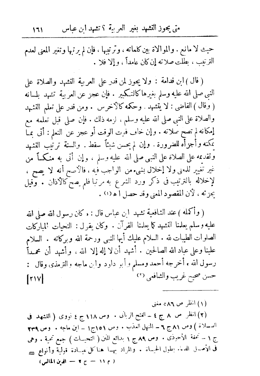 (قال) ابن قدامة: ولا يجوز لمن قدر على العربية التشهد والصلاة على النبى صلى الله عليه وسلم بغيرها كالتكبير. فإن عجز عن العربية تشهد بلسانه (وقال) القاضى: لا يتشهد. وحكمه كالأخرس. ومن قدر على تعلم التشهد والصلاة على النبى صلى الله عليه وسلم، لزمه ذلك. فإن صلى قبل تعلمه مع إمكانه لم تصح صلاته. وإن خاف فوت الوقت أو عجز عن التعلم، أتى بما يمكنه وأجزأه للضرورة. وإن لم يحسن شيئاً سقط. والسنة ترتيب التشهد وتقديمه على الصلاة على النبى صلى الله عليه وسلم. وإن أتى به منكّساً من غير تغيير للمعنى ولا إخلال بشئ من الواجب فيه، فالأصح أنه لا يصح، لإخلاله بالترتيب فى ذكْر ورد الشرع به مرتبا فلم يصح كالأذان. وقيل يجزئه، لأن المقصود المعنى وقد حصل أهـ (¬1).