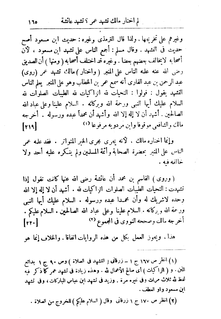 وإنما اختاره مالك، لأنه يجرى مجرى الخبر المتواتر. فقد علَّمه عمر الناس على المنبر بحضرة الصحابة وأئمة المسمين ولم ينكره عليه أحمد ولا خافه فيه (وروى) القاسم بن محمد أنّ عائشة رضى الله عنها كانت تقول إذا تشهدتُ: التحيات الطيبات الصلوات الزاكيات لله. أشهد أن لا إله إلا الله وحده لا شريك له وأن محمدا عبده ورسوله. السلام عليك أيها النبى ورحمة الله وبركاته. السلام علينا وعلى عباد الله الصالحين. السلام عليكم. أخرجه مالك وصححه النووى فى المجموع (¬2) {220}