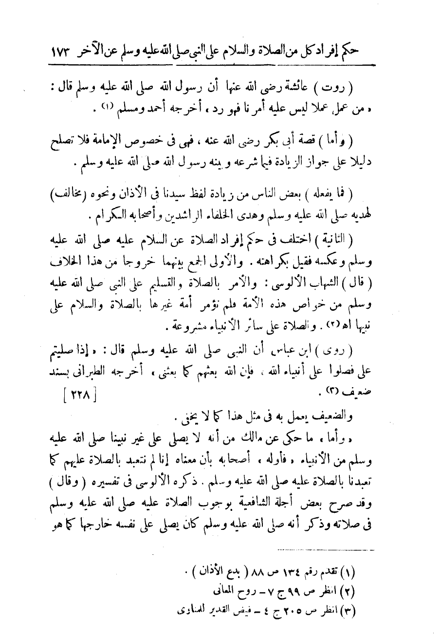 (الثانية) اختلف فى حكم إفراد الصلاة عن السلام عليه صلى الله عليه وسلم وعكسه فقيل بكراهته. والأولى الجمع بينهما خروجا من هذا الخلاف (قال) الشهاب الأوسى: والأمر بالصلاة والتسليم على النبى صلى الله عليه وسلم من خواص هذه الأمّة فلم تؤمر أمّة غيرها بالصلاة والسلام على نبيها أهـ (¬2). والصلاة على سائر الأنبياء مشروعة (روى) ابن عباس أنّ النبى صلى الله عليه وسلم قال: " إذا صلّيتم علىَّ فصلوا على أنبياء الله، فإن الله بعثهم كما بعثنى " أخرجه الطبرانى بسند ضعيف (¬3) {228}
