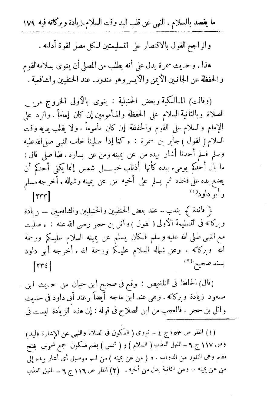 (فادئة) يندب - عند بعض الحنفيين والحنبليين والشافعيين - زيادة وبركاته فى التسليمة الأولى (لقول) وائل بن حُجْر رضى الله عنه: " صليتُ مع النبى صلى الله عليه وسلم فكان يُسلم عن يمينه السلام عليكم ورحمة الله وبركاته. وعن شماله السلام عليكم ورحمة الله " أخرجه أبو داود بسند صحيح (¬2) {234}