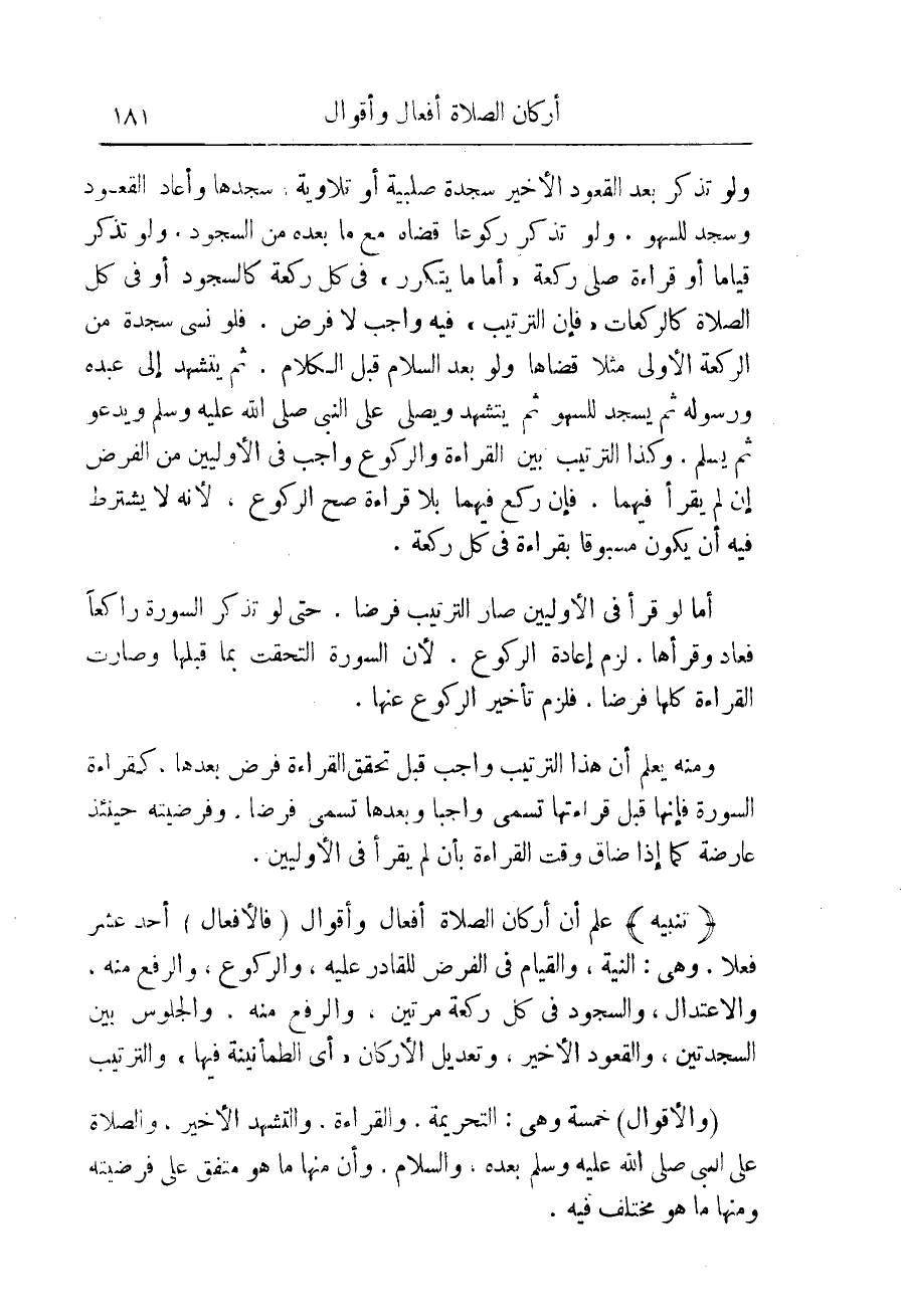 ولو تذكر بعد القعود الأخير سجدة صلبية أو تلاوية، سجدها وأعاد القعود وسجد للسهو. ولو تذكر ركوعا قضاه مع ما بعده من السجود. ولو تذكر قياما أو قراءة صلى ركعة " أما ما يتكرّر " فى كل ركعة كالسجود أو فى كل الصلاة كالركعات " فإن الترتيب " فيه واجب لا فرض. فلو نسى سجدة من الركعة الأولى **مثلا قضاها ولو بعد السلام قبل الكلام. ثم يتشهد إلى عبده** ورسوله ثم يسجد للسهو ثم يتشهد ويصلى على النبى صلى الله عليه وسلم ويدعو **ثم يسلم. وكذا الترتيب بين القراءة والركوع واجب فى الأوليين من الفرض إن لم يقرأ فيهما. فإن ركع فيهما بلا قراءة صح الركوع، لأنه لا يشترط فيه أن يكون مسبوقا بقراءة فى كل ركعة. أما لو قرأ فى الأوليين صار الترتيب فرضا، حتى لو تذكر السورة راكعاً فعاد وقرأها، لزم إعادة الركوع، لأن السورة التحقت بما قبلها وصارت القراءة كلها فرضا. فلزم تأخير الركوع عنها. ومنه يعلم أن هذا الترتيب واجب قبل تحقق** القراءة فرض بعدها، كقراءة السورة فإنها قبل قراءتها تسمى واجب وبعدها تسمى فرضا. وفرضيته حينئذ عارضة كما إذا ضاق وقت القراءة بأن لم يقرأ فى الأوليين.