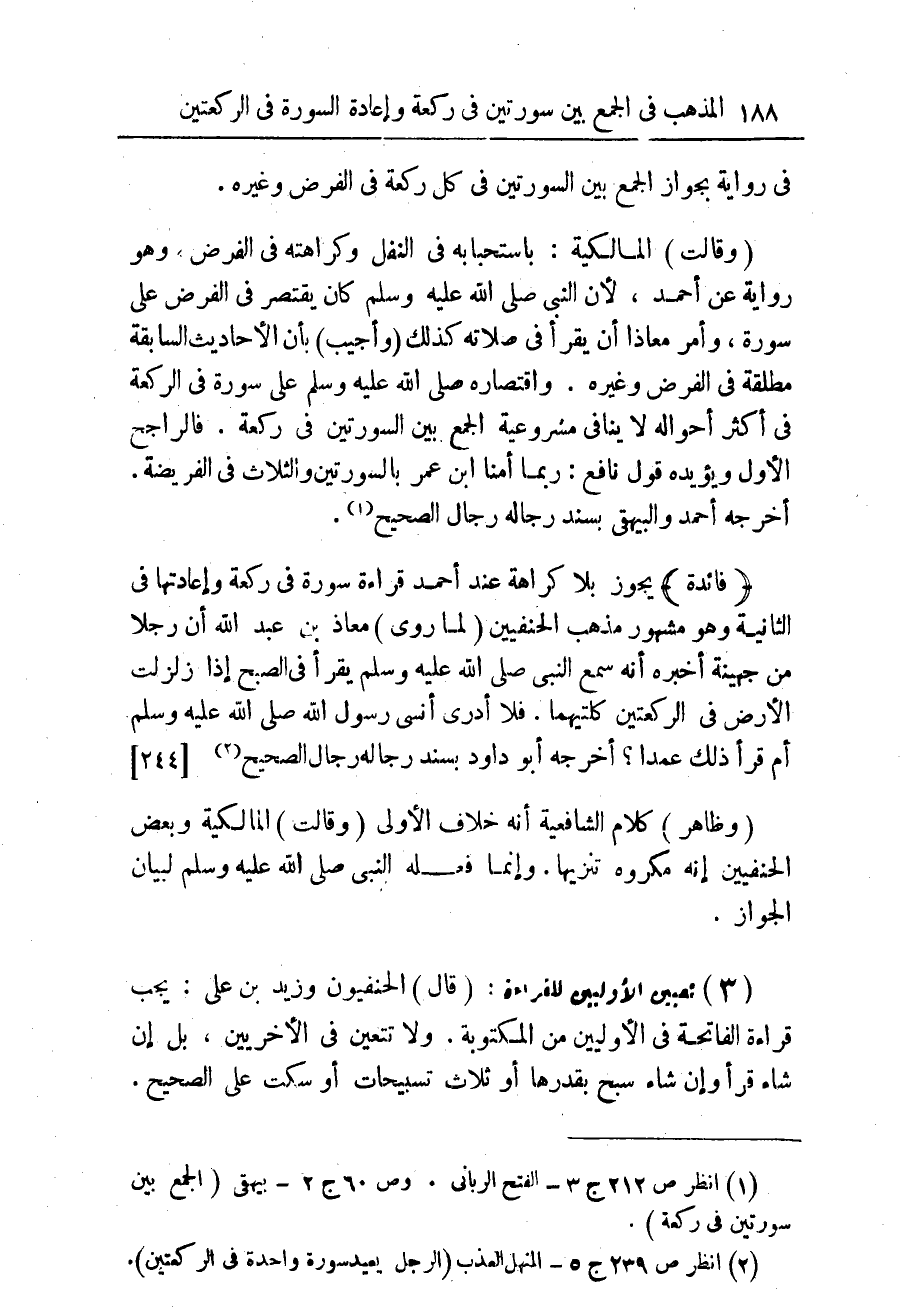 (وقالت) المالكية: باستحبابه فى النفل وكراهته فى الفرض. وهو رواية عن أحمد، لأن النبى صلى الله عليه وسلم كان يقتصر فى الفرض على سورة، وأمر معاذا أن يقرأ فى صلاته كذلك (وأجيب) بأن الأحاديث السابقة مطلقة فى الفرض وغيره. واقتصاره صلى الله عليه وسلم على سورة فى الركعة فى أكثر أحواله لا ينافى مشروعية الجمع بين السورتين فى ركعة. فالراجح الأوّل ويؤيده قول نافع: ربما أمّنا ابن عمر بالسورتين والثلاث فى الفريضة. أخرجه أحمد والبيهقى بسند رجاله رجال الصحيح (¬1)