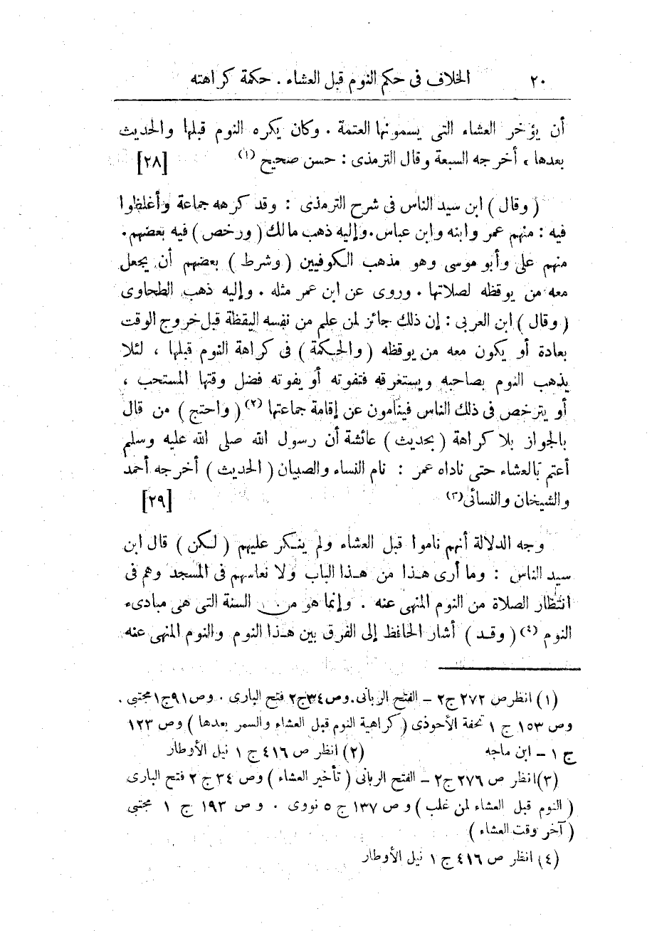 (¬1) ص 272 ج 2 - الفتح الربانى. وص 34 ج 2 فتح البارى. وص 91 ج 1 مجتبى وص 153 ج 1 تحفة الأحوذى (كراهية النوم قبل العشاء والسمر بعدها) وص 123 ج 1 - ابن ماجه.