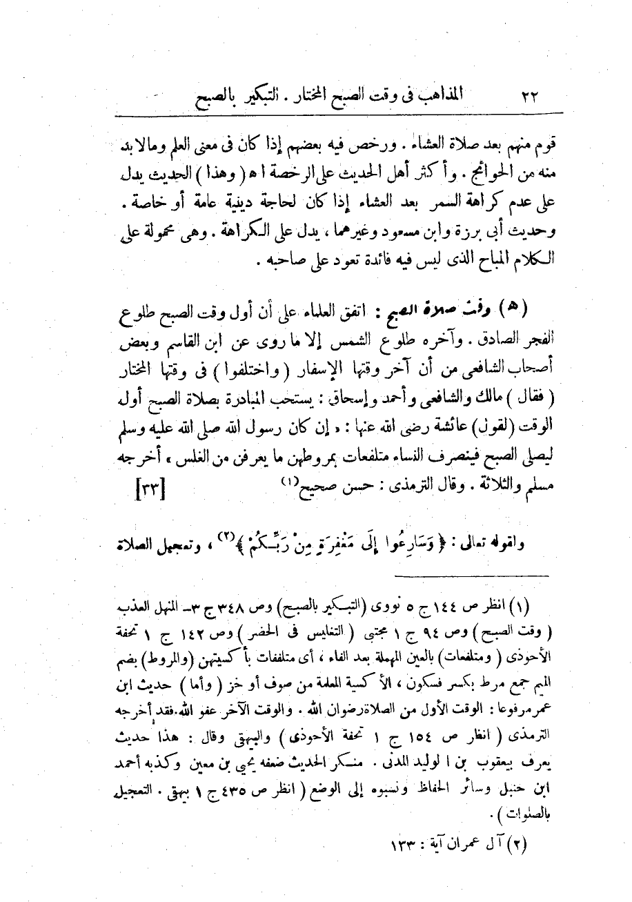 (¬1) ص 44 ج 5 نووى (التبكير بالصبح) وص 348 ج 3 المنهل العذب (وقت الصبح) وص 194 ج 1 مجتبى (التغليس فى الحضر) وص 142 ج 1 تحفة الأحوذى (ومتلفعات) بالعين المهملة بعد الفاء، أى متلففات بأكسيتهن (والمروط) بضم الميم جمع مرط بكسر فسكون، الأكسية المعلمة من صوف أوخز (وأما) حديث ابن عمر مرفوعا: الوقت الأول من الصلاة رضوان الله. والوقت الآخر عقو الله. فقد أخرجه الترمذى (ص 154 ج 1 تحفة الأحوذى) والبيهقى وقال: هذا حديث يعرف بيعقوب ابن لويد المدنى. منكر الحديث ضعفه يحيى بن معين وكذبه أحمد بن حنبل وسائر الحفاظ ونسبوه إلى الوضع (ص 435 ج 1 بيهقى. التعجيل بالصلوات).