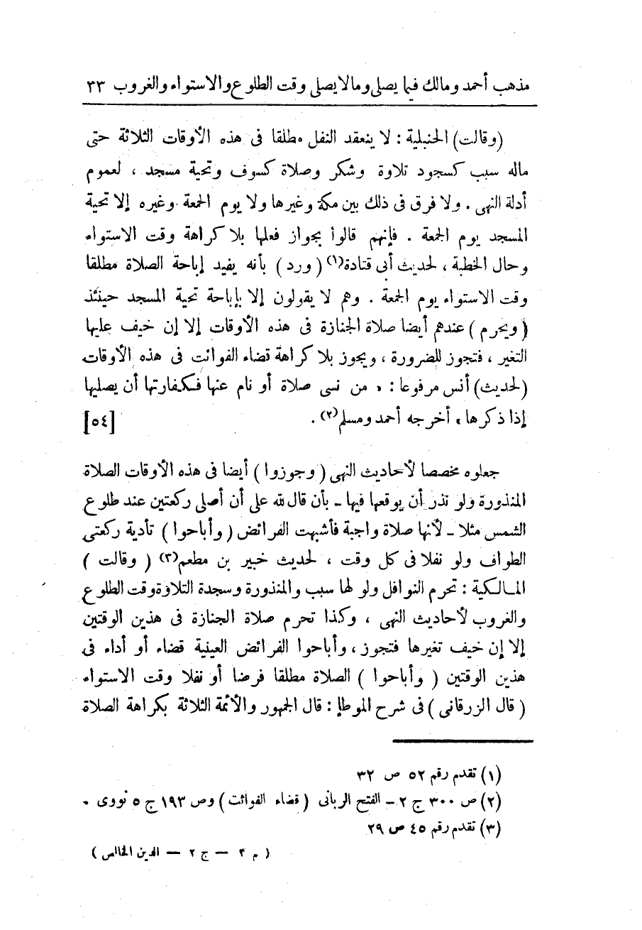 جعلوه مخصصا لأحاديث النهى (وجوّزوا) أيضا فى هذه الأوقات الصلاة المنذورة ولو نذر أن يوقعها فيها - بأن قال لله علّى أن أصلى ركعتين عند طلوع الشمس مثلا - لأنها صلاة واجبة فأشبهت الفرائض (وأباحوا) تأدية ركعتى الطواف ولو نفلا فى كل وقت، لحديث خبير بن مطعم (¬3) (وقالت) المالكية: تحرم النوافل ولو لها سبب والمنذورة وسجدة التلاوة وقت الطلوع والغروب لأحاديث النهى، وكذا تحرم صلاة الجنازة فى هذين الوقتين إلا إن خيف تغيرها فتجوز، وأباحوا الفرائض العينية قضاء أو أداء فى هذين الوقتين (وأباحوا) الصلاة مطلقا فرضا أو نفلا وقت الاستواء (قال الزرقانى) فى شرح الموطأ: قال الجمهور والأئمة الثلاثة بكراهة الصلاة