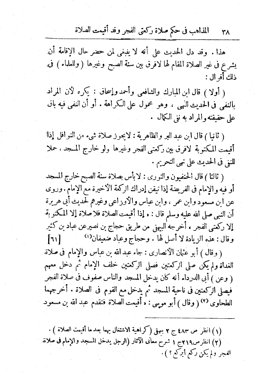 (¬2) انظر ص 219 ج 1 شرح معانى الآثار (الرجل يدخل المسجد والإمام فى صلاة الفجر ولم يكن ركع أيركع؟ ).