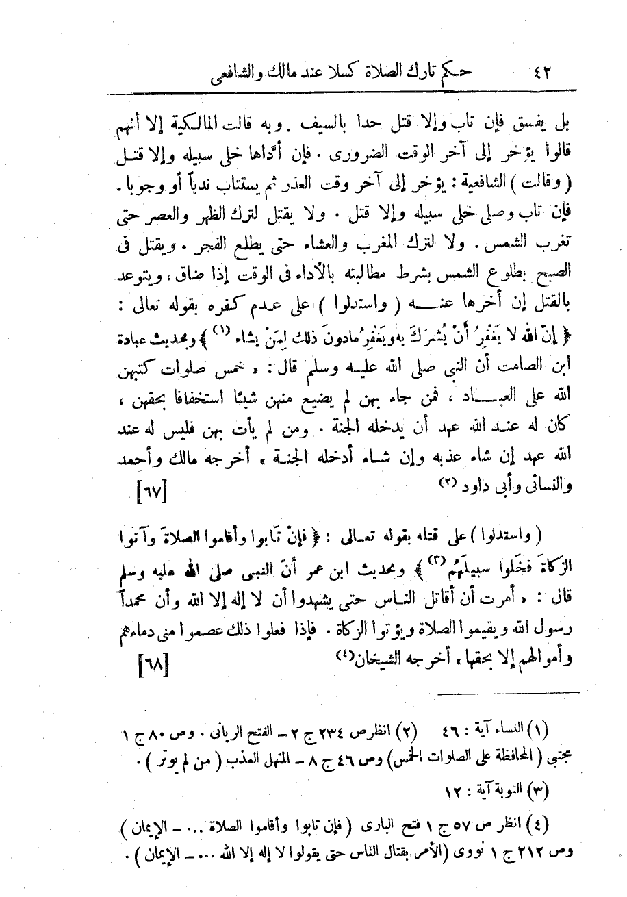 (¬4) انظر ص 57 ج 1 فتح البارى (فإن تابوا وأقاموا الصلاة .... - الإيمان) وص 212 ج 1 نووى (الأمر بقتال الناس حتى يقولوا لا إله إلا الله ... - الإيمان).