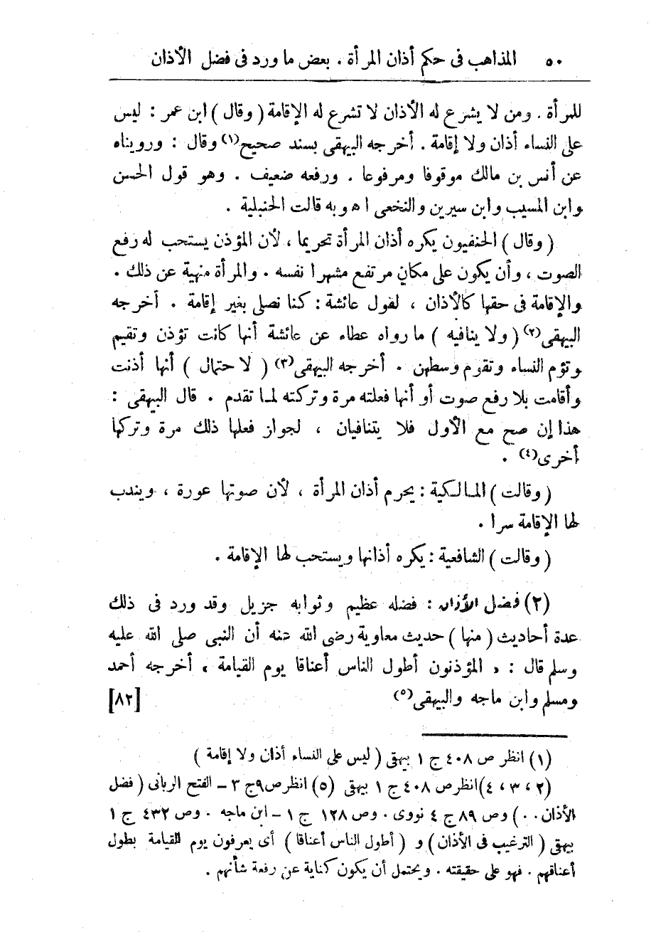 (2) فضل الأذان: فضله عظيم وثوابه جزيل وقد ورد فى ذلك عدّة أحاديث (منها) حديث معاوية رضى الله عنه أنّ النبى صلى الله عليه وسلم قال: " المؤذنونَ أطولُ الناس أعناقا يومَ القيامة " أخرجه أحمد ومسلم وابن ماجه والبيهقى (¬5) {82}