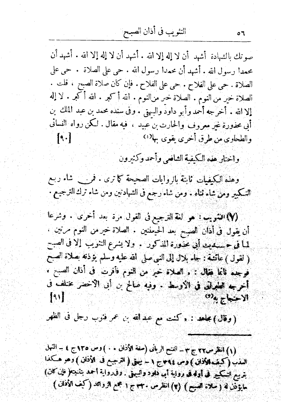 (¬1) انظر ص 22 ج 3 - الفتح الربانى (صفة الأذان) وص 135 ج 4 - المنهل العذب (كيف الأذان) وص 394 ج 1 - بيهقى (الترجيع فى الأذان) وهو هكذا بتربيع التكبير فى أوله فى رواية أبى داود والبيهقى. وفى رواية أحمد بتثنيته (فإن كان) ما يؤذن له (صلاة الصبح).