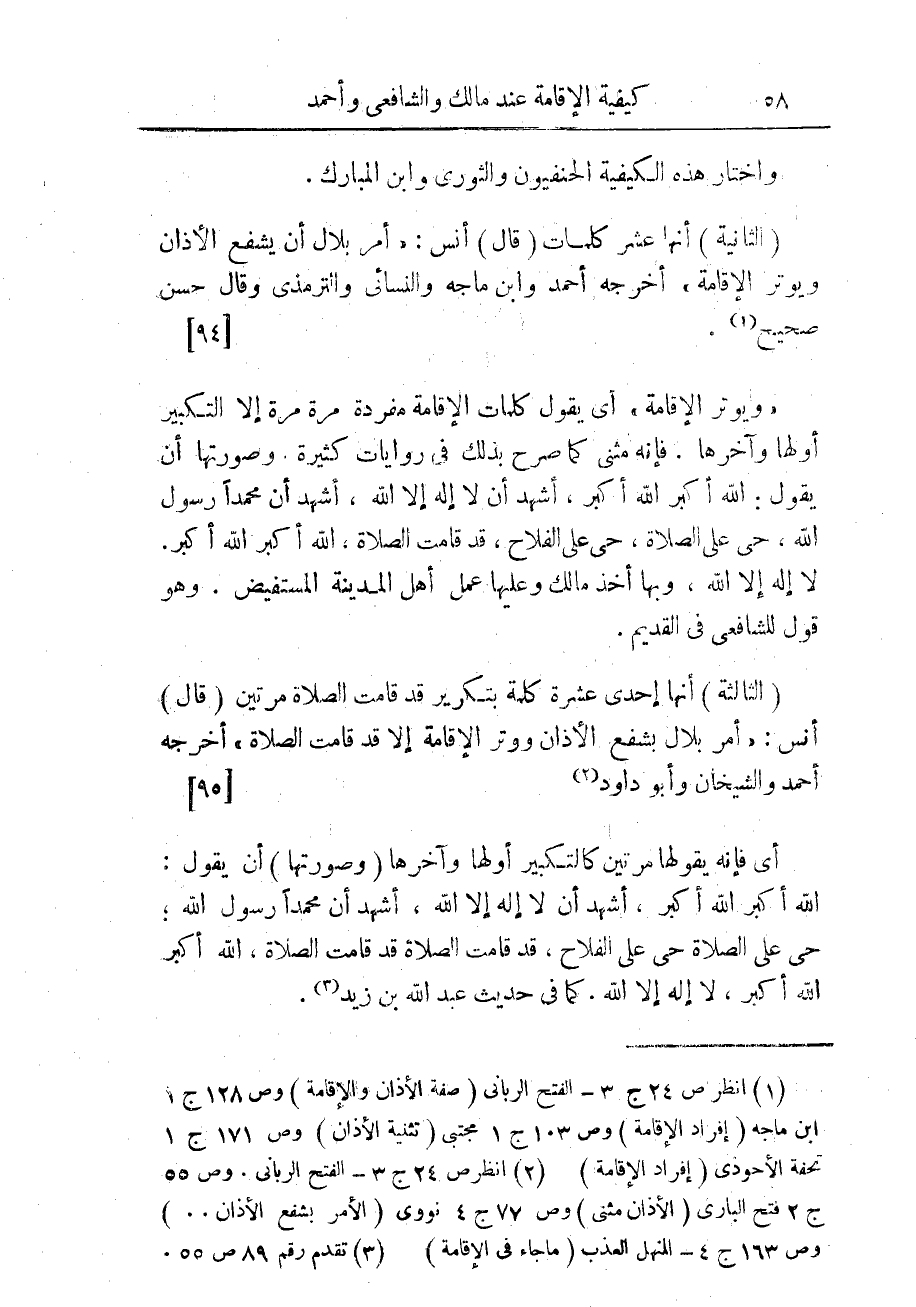 (¬2) انظر ص 24 ج 3 - الفتح الربانى. وص 55 ج 2 فتح البارى (الأذان مثنى) وص 77 ج 4 نووى (الأمر بشفع الأذان ... ) وص 163 ج 4 - المنهل العذب (ما جاء فى الإقامة).