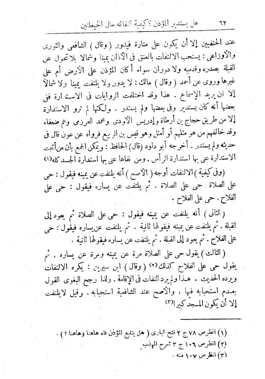 (الثانى) أنه يلفت عن يمينه فيقول: حى على الصلاة ثم يعود إلى القبلة. ثم يلتفت عن يمينه فيقولها ثانية. ثم يلتفت عن يساره فيقول: حى على الفلاح. ثم يعود إلى القبلة. ثم يلتفت عن يساره فيقولها ثانية.