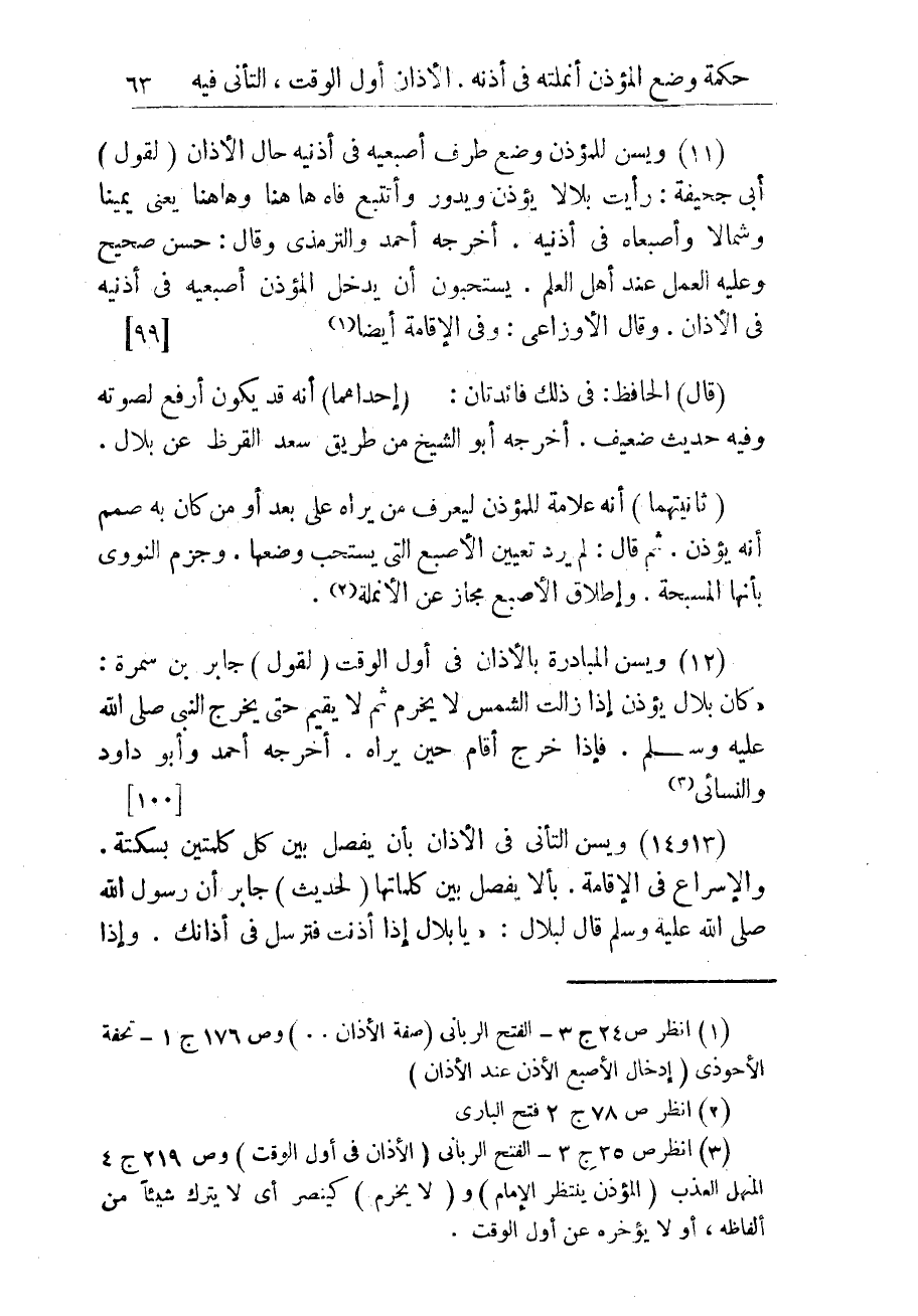 (¬1) انظر ص 24 ج 3 - الفتح الربانى (صفة الأذان ... ) وص 176 ج 1 - تحفة الأحوذى (إدخال الأصبع الأذن عند الأذان).