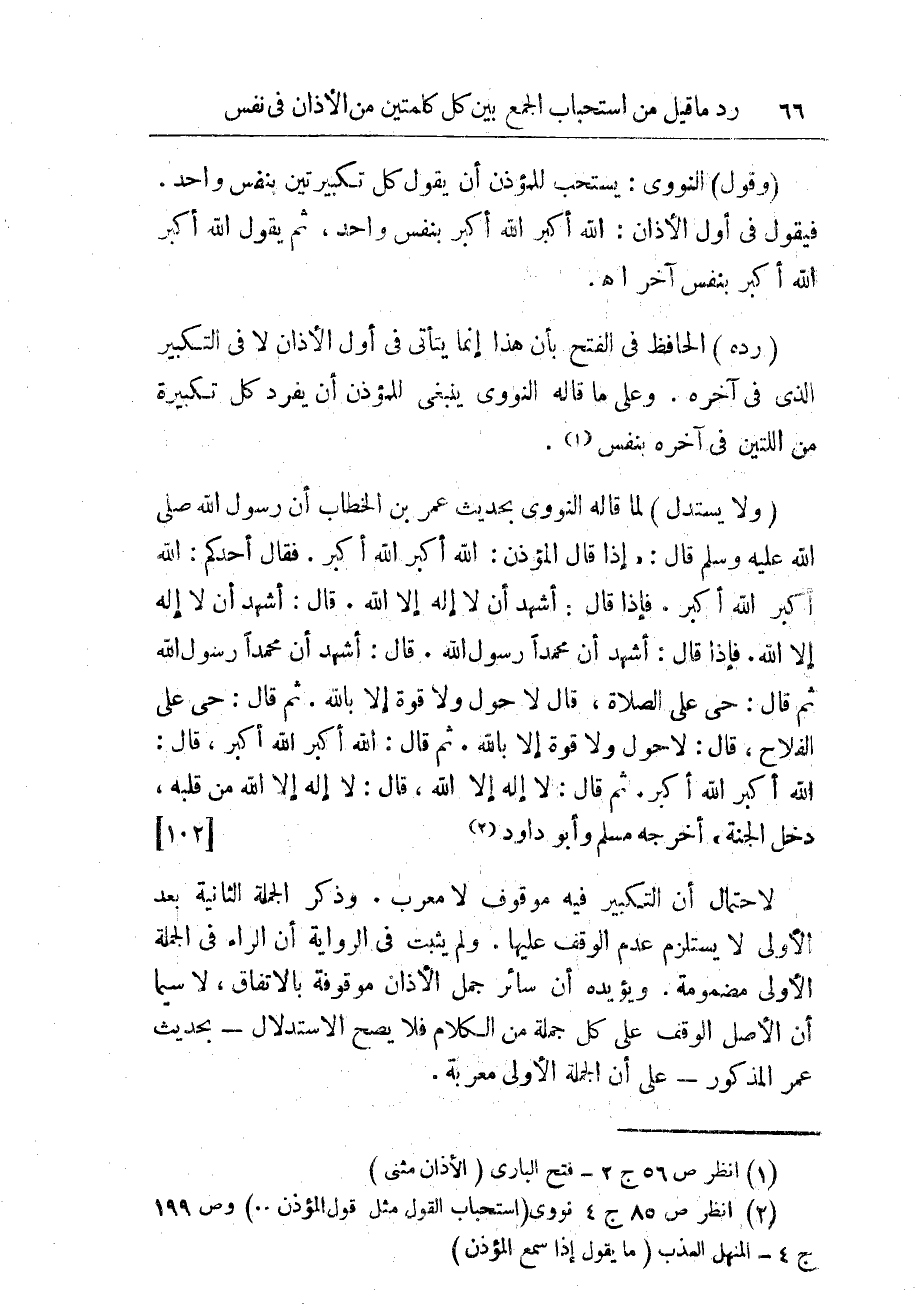(¬2) انظر ص 85 ج 4 نووى (استحباب القول مثل قول المؤذن .. ) وص 199 ج 4 - المنهل العذب (ما يقول إذا سمع المؤذن).