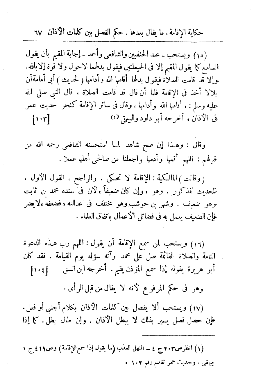 (وقالت) المالكية: الإقامة لا تحكى. والراجح، القول الأول، للحديث المذكور. وهو " إن كان ضعيفاً " لأن فى سنده محمد بن ثابت وهو ضعيف. وشهر بن حوشب وهو مختلف فى عدالته " فضعفه " لا يضر فإن الضعيف يعمل به فى فضائل الأعمال باتفاق العلماء.