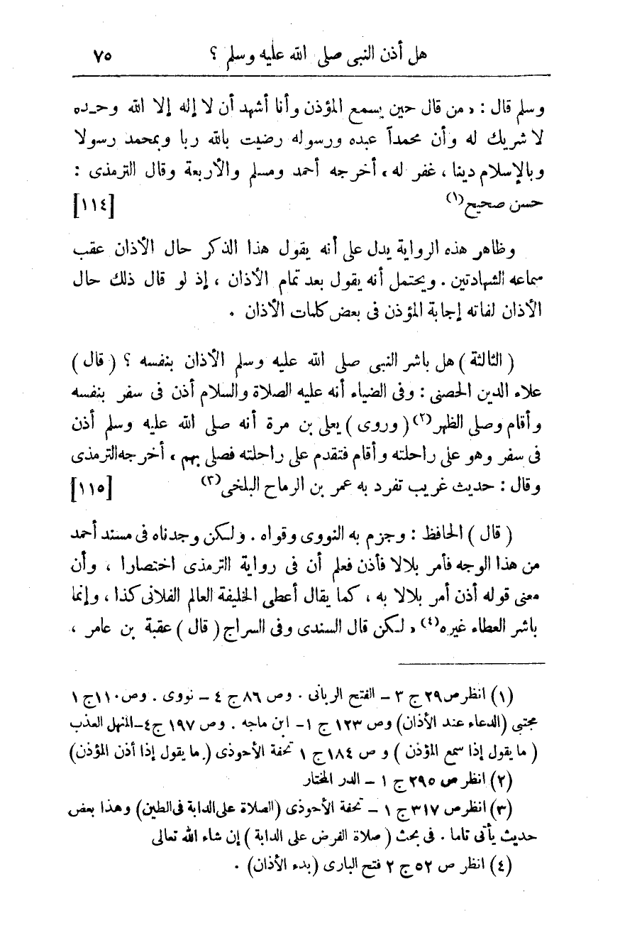 (الثالثة) هل باشر النبى صلى الله عليه وسلم الأذان بنفسه؟ (قال) علاء الدين الحصنى: وفى الضياء أنه عليه الصلاة والسلام أذن فى سفر بنفسه وأقام وصلى الظهر (¬2) (وروى) يعل ابن مرة نه صلى الله عليه