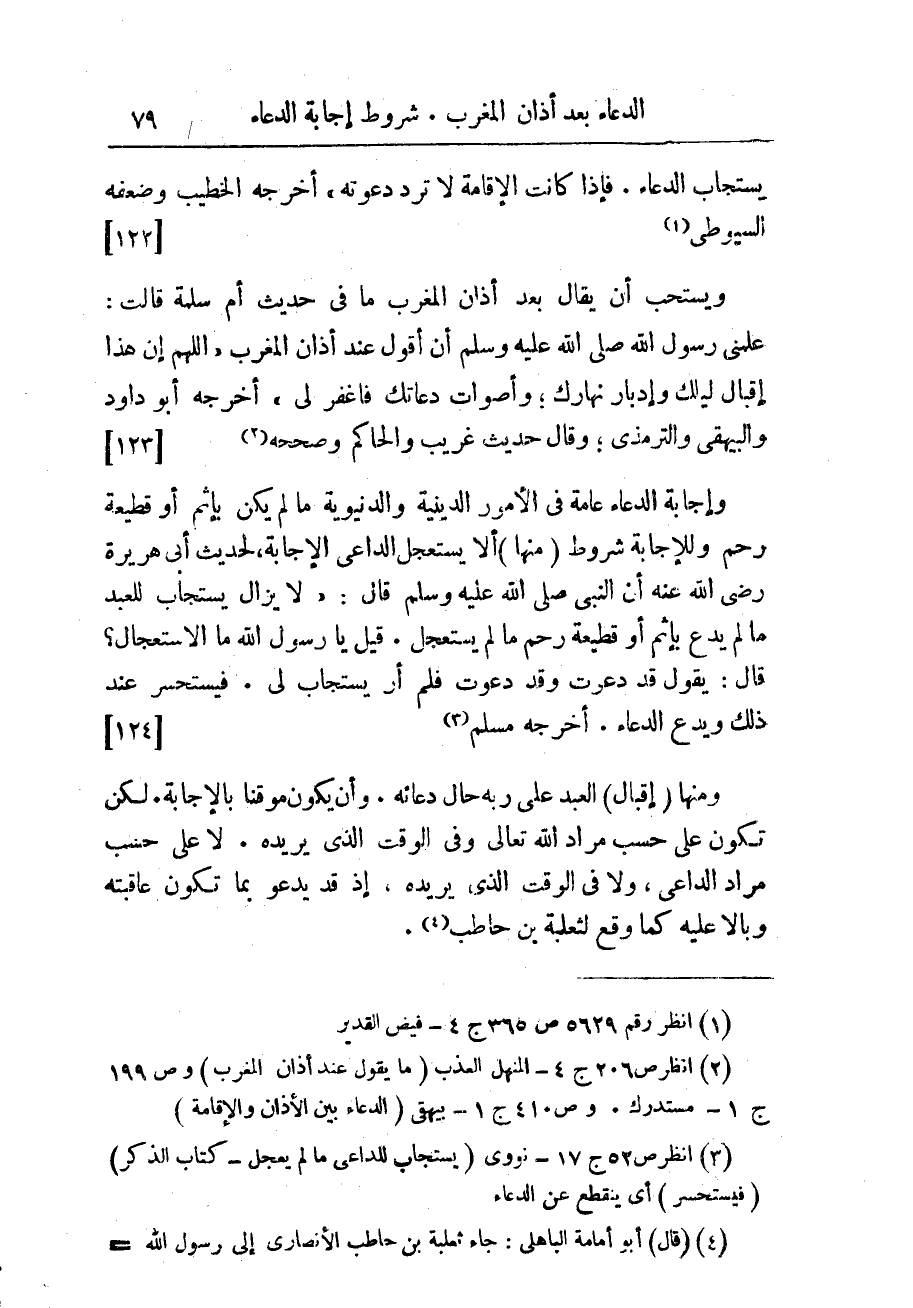 (¬2) انظر ص 206 ج 4 - المنهل العذب (ما يقول عند أذان المغرب) وص 199 ج 1 - مستدرك. وص 410 ج 1 - بيهقى (الدعاء بين الأذان والإقامة).