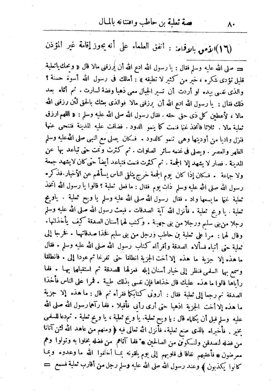 = صلى الله عليه وسلم فقال: يا رسول الله أدع الله أن يرزقنى مالا قال " ويحك يا ثعلبة قليل تؤدى شكره، خير من كثير لا تطيقه ": أمالك فى رسول الله أسوة حسنة؟ والذى نفسى بيده لو أردت أن تيسر الجبال معى ذهبا وفضة لسارت. ثم أتاه بعد ذلك فقال: يا رسول الله أدع الله أن يرزقنى مالا فوالذى بعثك بالحق لئن رزقنى الله مالا، لأعطين كل ذى حق حقه. فقال رسول الله صلى الله لعيه وسلم: " اللهم أرزق ثعلبة مالا. ثلاثا فاتخذ غنما فنمت كما ينمو الدود. فضاقت عليه المدينة فتنحى عنها فنزل واديا من أوديتها وهى تنمو كالدور. فكان يصلى مع النبى صلى الله عليه وسلم الظهر والعصر. ويصلى فى غنمه سائر الصلوات. ثم كثرت ونمت حتى تباعد بها عن المدينة. فصار لا يشهد إلا الجمعة. ثم كثرت فنمت فتباعد أيضاً حتى كان لا يشهد جمعة ولا جماعة. فكان إذا كان يوم الجمعة خرج يتلقى الناس يسألهم عن الأخبار. فذكره رسول الله صلى الله عليه وسلم ذات يوم فقال: ما فعل ثعلبه؟ قالوا يا رسول الله اتخذ ثعلبة غنما ما يسعها واد. فال رسول الله صلى الله عليه وسلم يا ويح ثعلبة. يا ويح ثعلبة. يا ويح ثعلبة. فأنزل الله آية الصدقات. فبعث رسول الله صلى الله عليه وسلم رجلا من بنى سليم ورجلا من بنى جهينة. وكتب لهما أسنان الصدقة كيف يأخذانها. وقال لهما: مرآ على ثعلبه بن حاطب ورجل بنى سليم فخذا صدقاتهما. فخرجا إلى ثعلبة حتى أتياه فسألاه الصدقة وأقرأاه كتاب رسول الله صلى الله عليه وسلم .. فقال ما هذه إلا جزية ما هذه إلا أخت الجزية انطلقا حتى تفرغا ثم عودا إلى. فانطلقا وسمع بهما السلمى فنظر على خيار أسنان إبله فعزلها للصدقة ثم استقبلهما بها. فلما رأياها قالوا ما هذه عليك قال خذاها فإن نفسى بذلك طيبة. فمرا على الناس فأخذا الصدقة ثم رجعا إلى ثعلبة فقال: أرونى كتابكما فقرأة ثم قال: ما هذه إلا جزية ما هذه إلا أخت الجزية اذهبا حتى رأى رأنى فاقبلا. فلما رآهما رسول الله صلى الله عليه وسلم قبل أن يكلماه قال: يا ويح ثعلبة. يا ويح ثعلبة. يا ويح ثعلبة. ثم دعا للسلمى بخير. فأخبراه بالذى صنع ثعلبة. فأنزل الله تعالى فيه {ومنهم من عاهد الله لئن آتانا من فضله لتصدقن ولتكونن من الصالحين * فلما آتاهم من فضله بخلوا به وتولوا وهم معرضون * فأعقبهم نفاقا فى قلوبهم إلى يوم يلقونه بما أخلفوا الله ما وعدوه وبما كانوا يكذبون} وعند رسول الله صلى الله عليه وسلم رجل من أقارب ثعلبة فسمع =