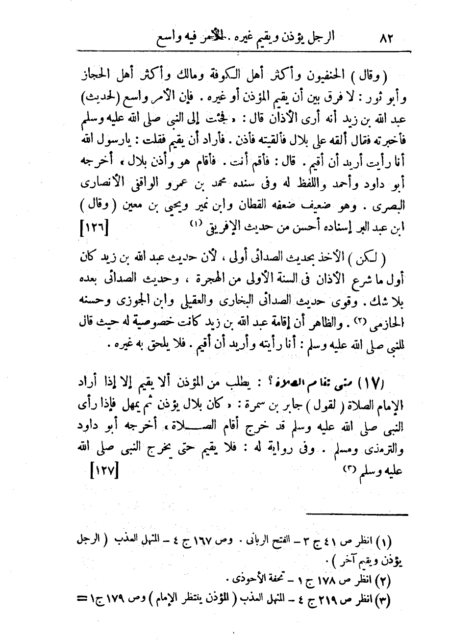 (¬1) انظر ص 41 ج 3 - الفتح الربانى. وص 167 ج 4 - المنهل العذب (الرجل يؤذن ويقيم آخر).