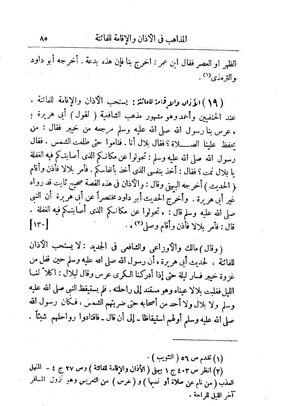 (¬2) انظر ص 403 ج 1 بيهقى (الأذان والإقامة للفائتة) وص 27 ج 4 - المنهل العذب (من نام عن صلاة أو نسيها) و (عرس) من التعريس وهو نزول المسافر آخر الليل للراحة.