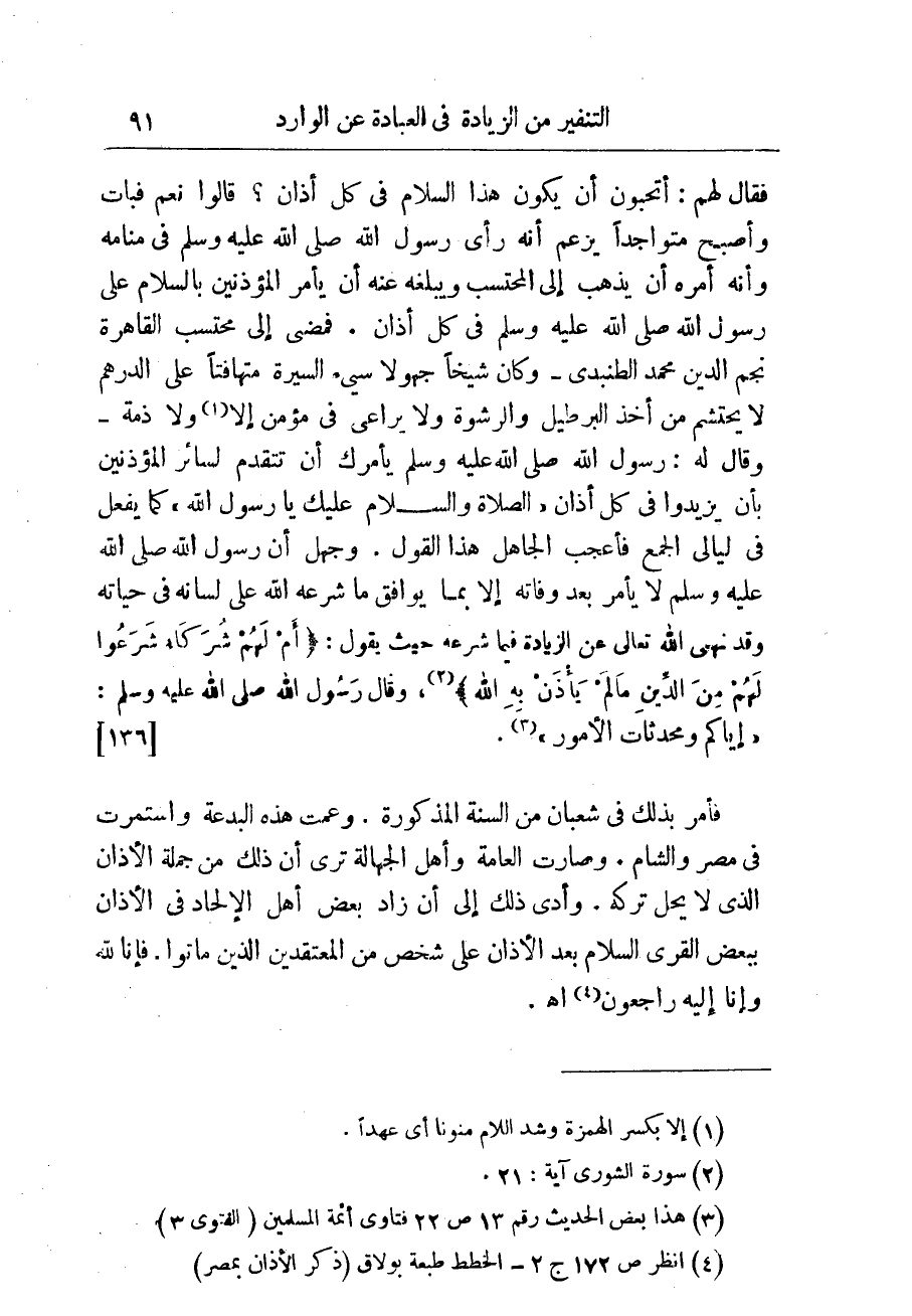 فأمر بذلك فى شعبان من السنة المذكورة. وعمت هذه البدعة واستمرت فى مصر والشام. وصارت العامة وأهل الجهالة ترى أن ذلك من جملة الأذان الذى لا يحل تركه. وأذى ذلك إلى أن زاد بعض أهل الإلحاد فى الأذان ببعض القرى السلام بعد الأذان على شخص من المعتقدين الذين ماتوا. فإنا لله وإنا إليه راجعون (¬4) أهـ.