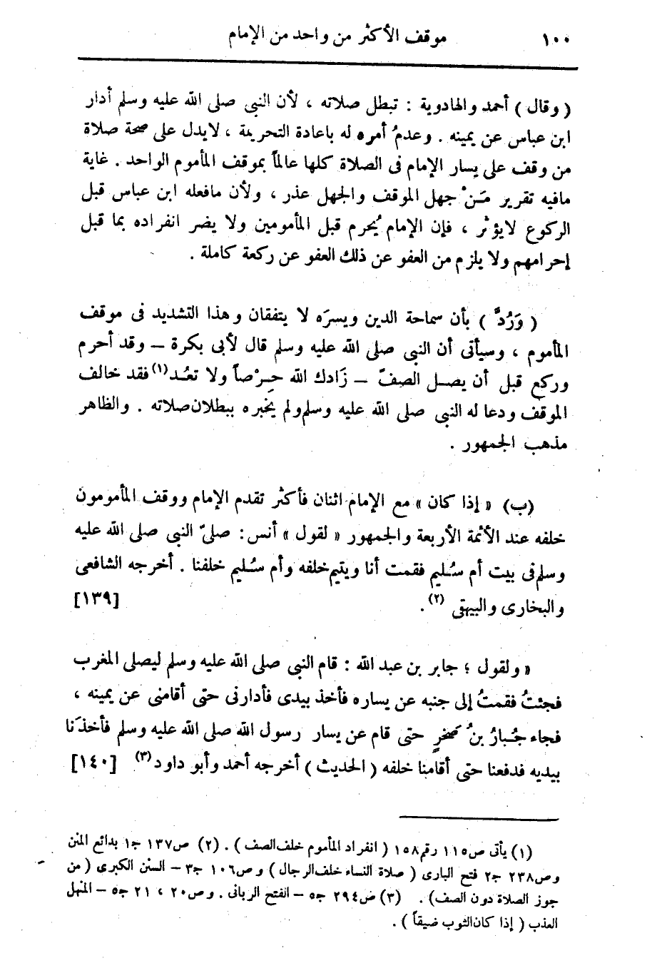 (ب) " إذا كان " مع الإمام اثنان فأكثر تقدم الإمام ووقف المأمومون خلفه عند الأئمة الأربعة والجمهور "لقول" أنس: صلىّ النبى صلى الله عليه وسلم فى بيت أم سُليم فقمت أنا ويتيم خلفه وأم سُليم خلفنا. أخرجه الشافعة والبخارى والبيهقى (¬2). {139}