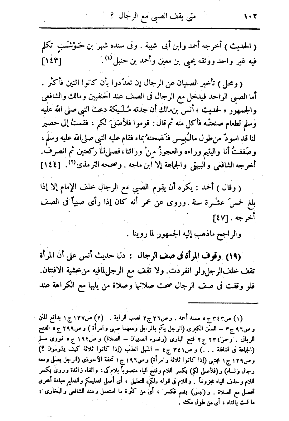 (ومحل) تأخير الصبيان عن الرجال إن تعدّدوا بأن كانوا اثنين فأكثر. أما الصبى الواحد فيدخل مع الرجال فى الصف عند الحنفيين ومالك الشافعى والجمهور " لحديث " أنس بن مالك أن جدته مُلَيكة دعت النبى صلى الله عليه وسلم لطعام صنعتْه فأكل منه ثم قال: قوموا فلأصلىِ لكم، فقمتُ إلى حصير لنا قد اسودّ من طول ما لُبِس فنَصحتهُ بماء فقام عليه النبى صلى الله عليه وسلم، وصَففتُ أنا واليتيم وراءه والعجوزُ مِنْ ورائنا، فصلى لنا ركعتين ثم انصرف. أخرجه الشافعى والبيهقى والجماعة إلا ابن ماجه. وصححه الترمذى (¬2). {144}