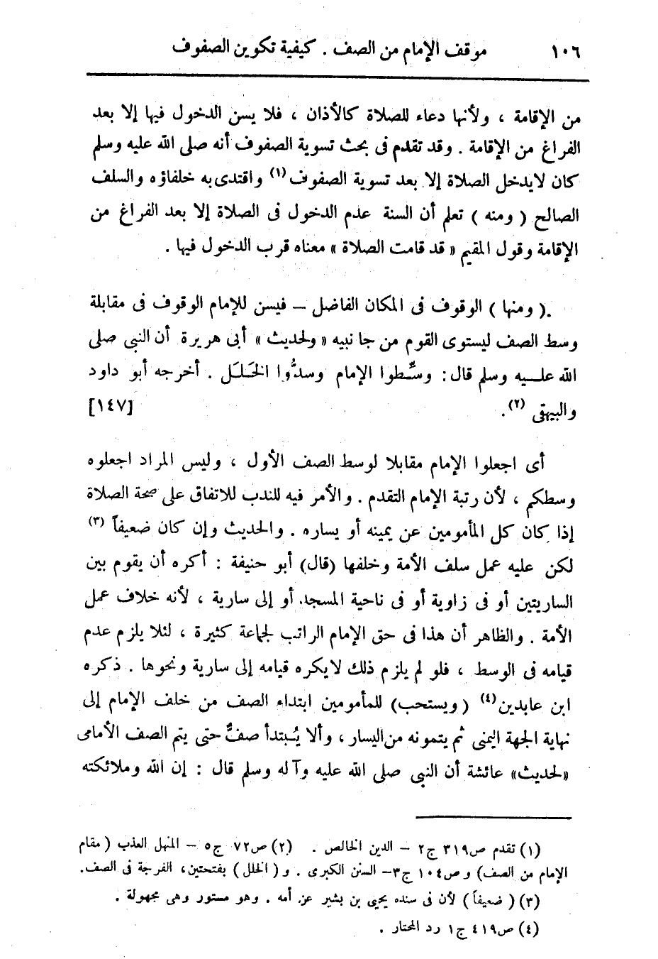 (ومنها) الوقوف فى المكان الفاضل - فيسن للإمام الوقوف فى مقابلة وسط الصف ليستوى القوم من جانبيه " ولحديث " أبى هريرة أن النبى صلى الله عليه وسلم قال: وسِّطوا الإمام وسدُّوا الخَلَل. أخرجه أبو داود والبيهقى (¬2). {147}