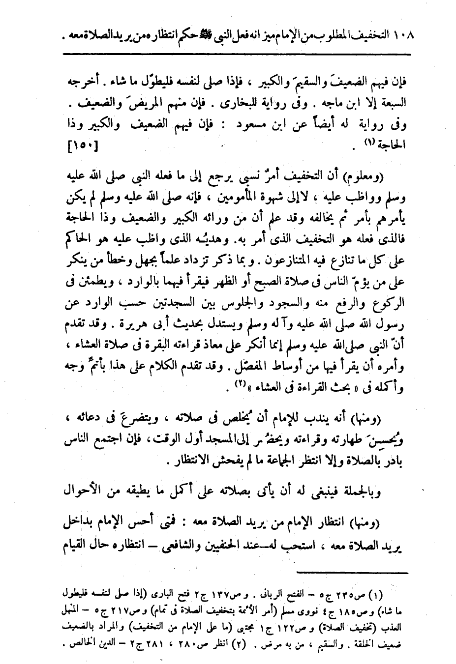 فإن فيهم الضعيفَ والسقيمَ والكبير، فإذا صلى لنفسه فليطوّل ما شاء. أخرجه السبعة إلا ابن ماجه. وفى رواية البخارى. فإن منهم المريضَ والضعيف. وفى رواية له أيضاً عن ابن مسعود: فإن فيهم الضعيف والكبير إذا الحاجة (¬1). {150}