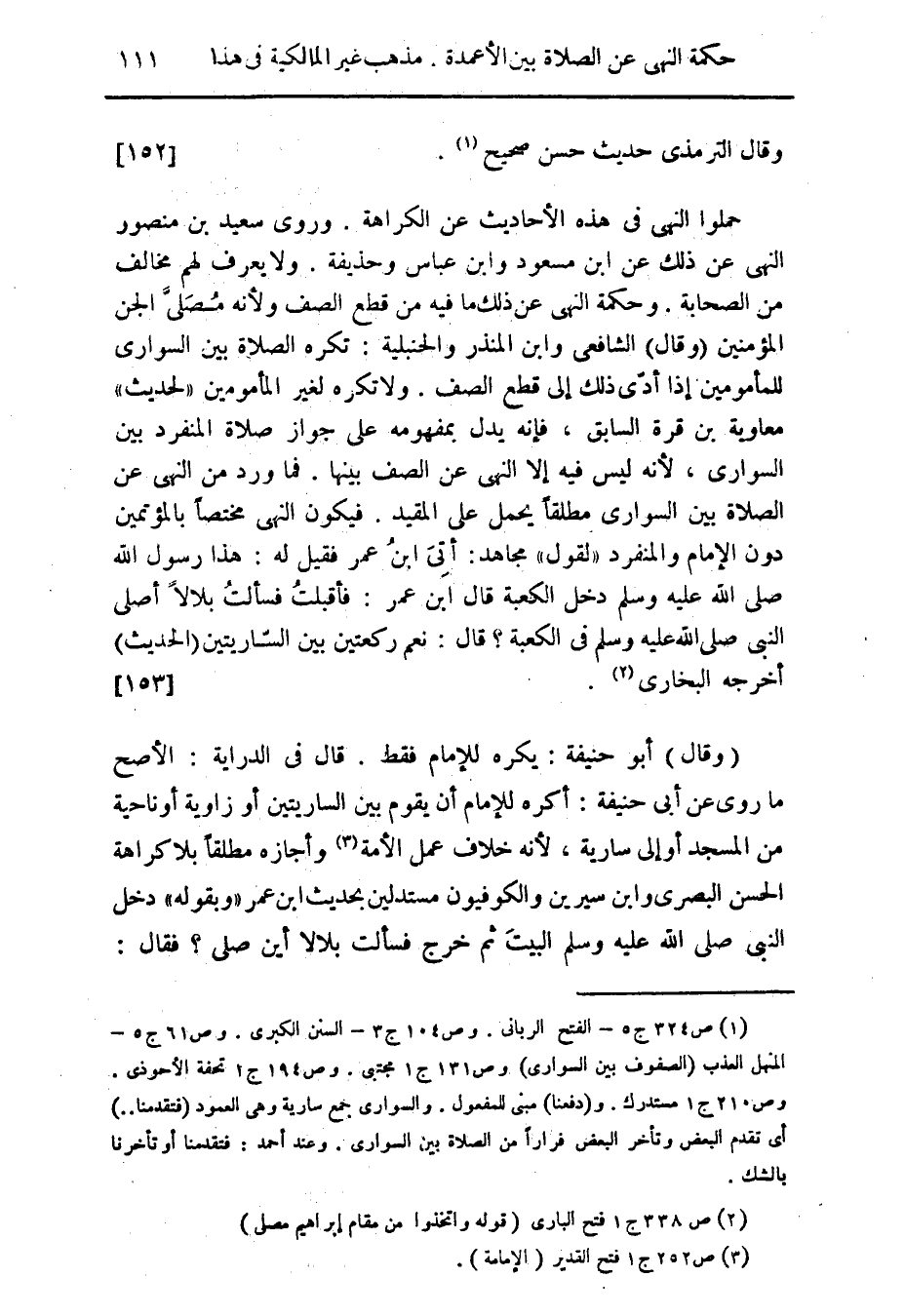 عباس وحذيفة. ولا يعرف لهم مخالف من الصحابة. وحكمة النهى عن ذلك ما فيه من قطع الصف ولأنه مُصَلىَّ الجن المؤمنين (وقال) الشافعى وابن المنذر والحنبلية: تكره الصلاة بين السوارى للمأمومين إذا أدى ذلك إلى قطع الصف. ولا تكره لغير المأمومين " لحديث " معاوية بن قرة السابق، فإنه يدل بمفهومه على جواز صلاة المنفرد بين السوارى، لأنه ليس فيه إلا النهى عن الصف بينها، فما ورد من النهى عن الصلاة بين السوارى مطلقاً يحمل على المقيد. فيكون النهى مختصاً بالمؤتمين دون الإمام والمنفرد " لقول " مجاهد: أتِىَ ابنُ عمر فقيل له: هذا رسول الله صلى الله عليه وسلم دخل الكعبة قال ابن عمر: فأقبلتُ فسألتُ بلالاً أصلى النبى صلى الله عليه وسلم فى الكعبة؟ قال: نعم ركعتين بين السّاريتين (الحديث) أخرجه البخارى (¬2). {153}