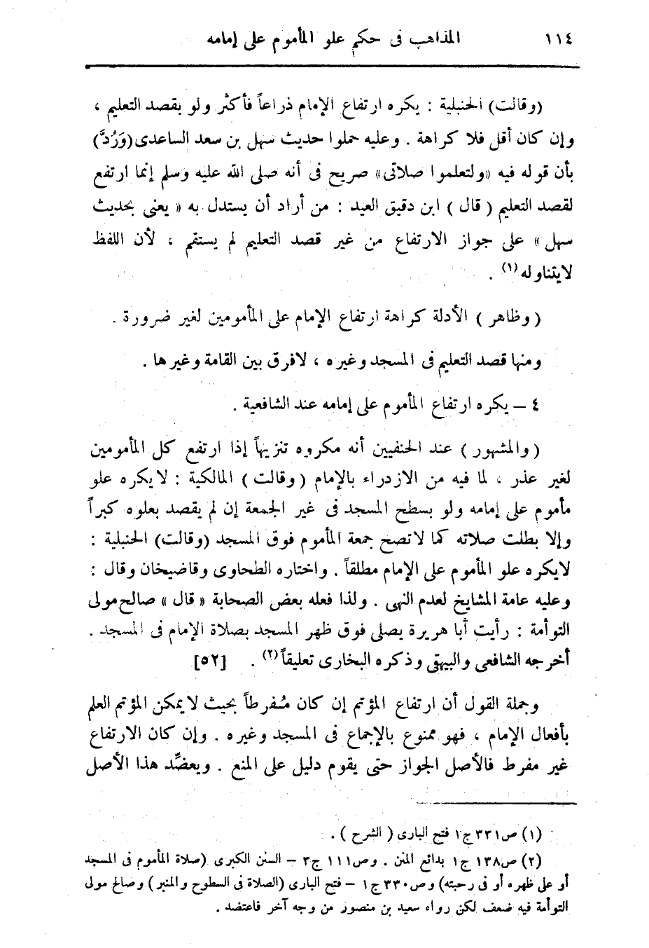 (والمشهور) عند الحنفيين أنه مكروه تنزيهاً إذا ارتفع كل المأمومين لغير عذر، لما فيه من الأزدراء بالإمام (وقالت) المالكية: لا يكره علو مأموم على إمامه ولو بسطح المسجد فى غير الجمعة إن لم يقصد بعلوه كبراً وإلا بطلت صلاته كما لا تصح جمعة المأموم فوق المسجد (وقالت) الحنبلية: لا يكره علو المأموم على الإمام مطلقاً. واختاره الطحاوى وقاضيخان وقال: وعليه عامة المشايخ لعدم النهى. ولذا فعله بعض الصحابة "قال" صالح مولى التوأمة: رأيت أبا هريرة يصلى فوق ظهر المسجد بصلاة الإمام فى المسجد. أخرجه الشافعى والبيهقى ذكره البخارى تعليقاً (¬2). {52}