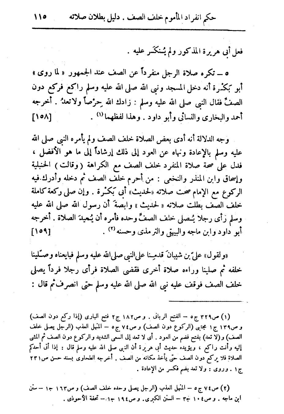 5 - تكره صلاة الرجل منفرداً عن الصف عند الجمهور " لما روى " أبو بَكَرة أنه دخل المسجد ونبى الله صلى الله عليه وسلم راكع فركع دون الصفِّ فقال النبى صلى الله عليه وسلم: زادك الله حِرْصاً ولا تعدُ. أخرجه أحمد والبخارى والنسائى وأبو داود. وهذا لفظهما (¬1). {158}