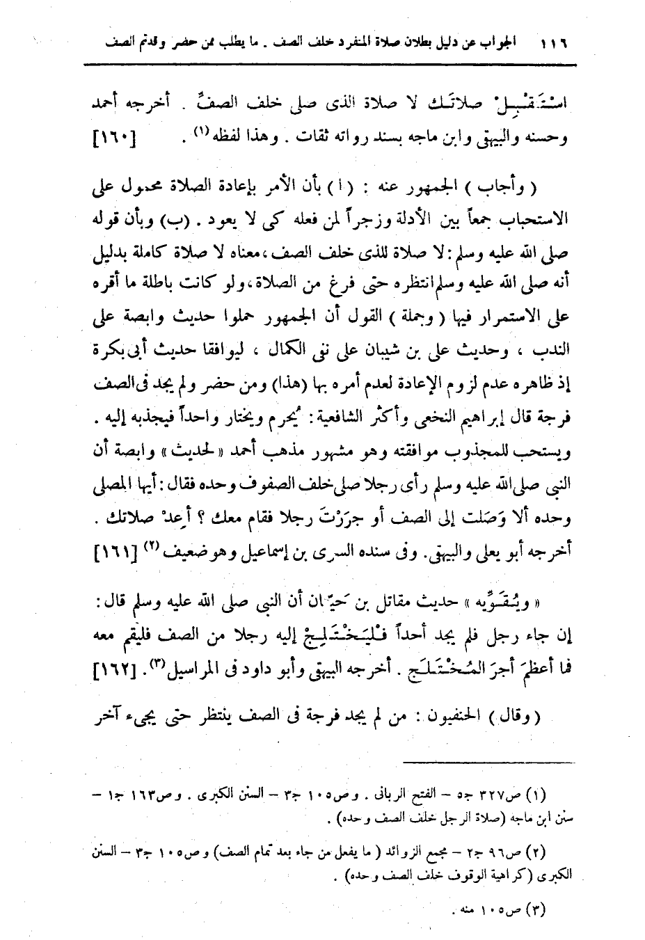 (¬1) ص 327 ج 5 - الفتح الربانى. وص 105 ج 3 - السنن الكبرى. وص 163 ج 1 - سنن ابن ماجه (صلاة الرجل خلف الصف وحده).