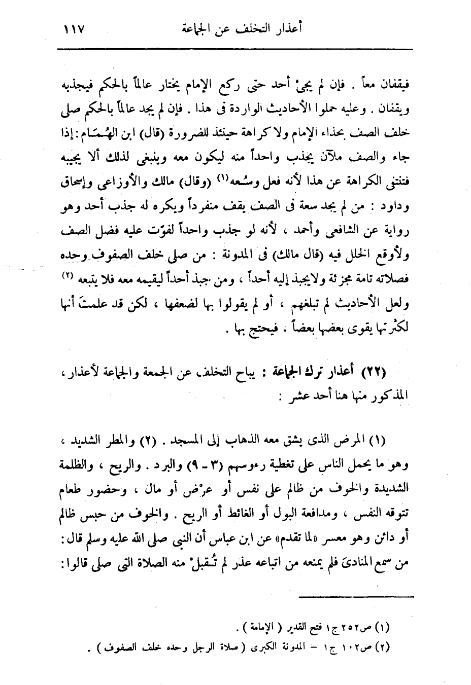 (22) أعذار ترك الجماعة: يباح التخلف عن الجمعة والجماعة لأعذار، المذكور منها هنا أحد عشر.