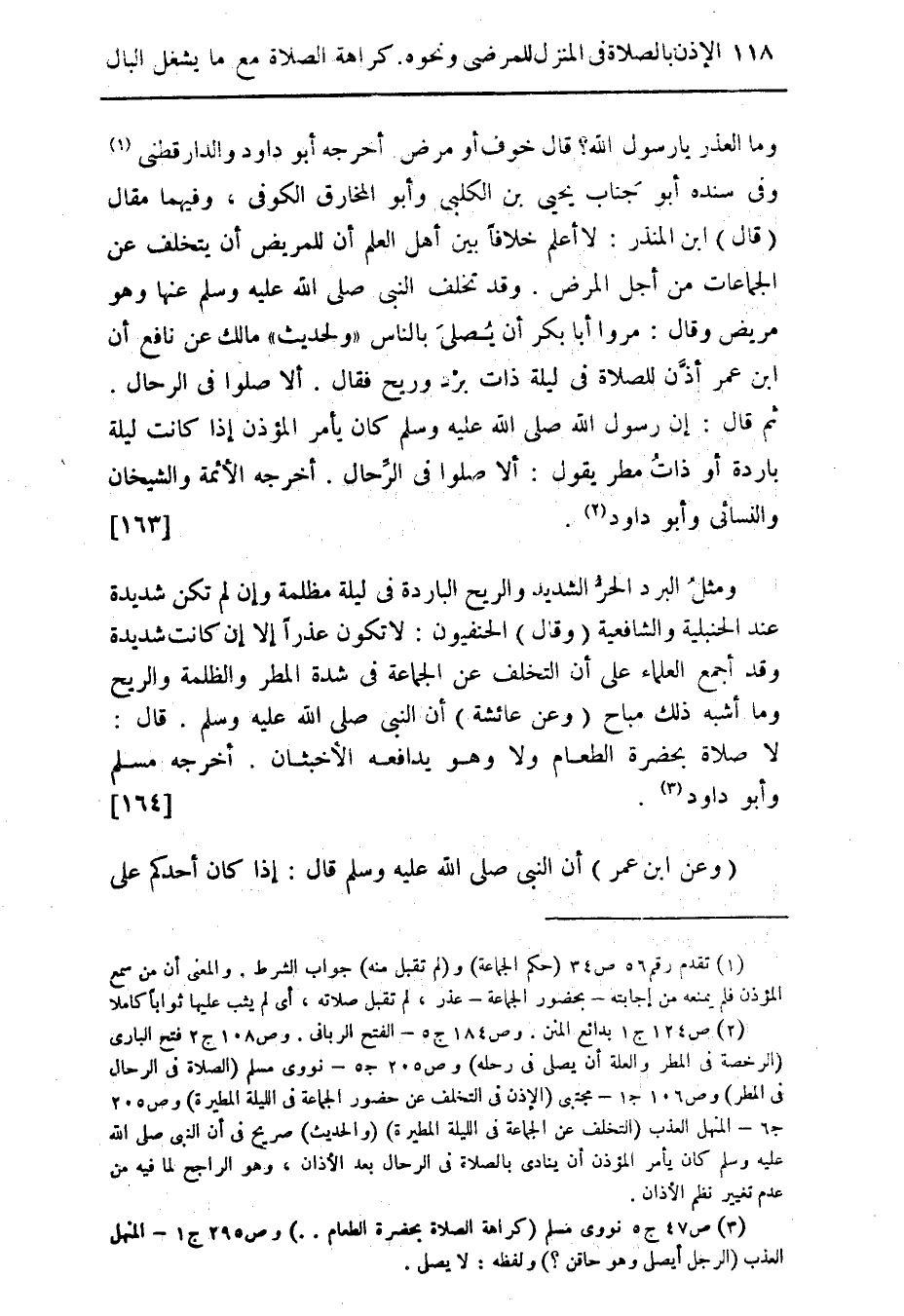 (¬2) ص 124 ج 1 بدائع المنن. وص 184 ج 5 - الفتح الربانى. وص 108 ج 2 فتح البارى (الرخصة فى المطر والعلة أن يصلى فى رحله) وص 205 ج 5 - نووى مسلم (الصلاة فى الرحال فى المطر) وص 106 ج 1 - مجتبى (الإذن فى التخلف عن حضور الجماعة فى الليلة المطيرة) وص 205 ج 6 المنهل العذب (التخلف عن الجماعة فى الليلة المطيرة) (والحديث) صريح فى أن النبى صلى الله عليه وسلم كان بأمر المؤذن أن ينادى بالصلاة فى الرحال بعد الأذان، وهو الراجح لما فيه من عدم تغيير نظم الأذان.