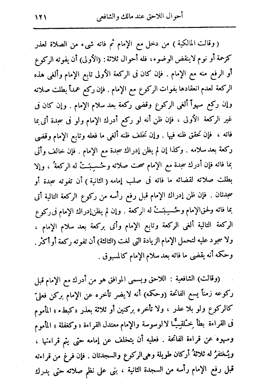 (وقالت) الشافعية: اللاحق ويسمى الموافق هو من أدرك مع الإمام قبل ركوعه زمناً يسع الفاتحة (وحكمه) أنه لا يضر تأخره عن الإمام بركن فعلىّ كالركوع ولو بلا عذر، ولا تأخره بركنين أو ثلاثة بعذر "كبطء" المأموم فى القراءة بطأ خِلْقِيًّا لا لوسوسة والإمام معتدل القراءة " وكغفلة " المأموم وسهوه عن قراءة الفاتحة. فعلية أن يتخلف عن إمامه حتى يتم قراءتها، ويُغتفرُ له ثلاثةُ أركان طويلة وهى الركوع والسجدتان. فإن فرغ من قراءته قبل رفع الإمام رأسه من السجدة الثانية، بنى على نظم صلاته حتى يدرك