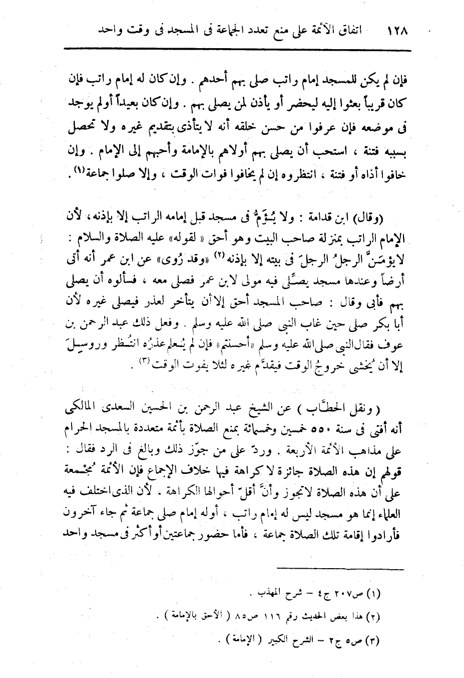 (ونقل الحطَّاب) عن الشيخ عبد الرحمن بن الحسين السعدى المالكى أنه أفتى فى سنة 550 خمسين وخمسمائة بمنع الصلاة بأئمة متعددة بالمسجد الحرام على مذاهب الأئمة الأربعة. وردّ على من جوّز ذلك وبالغ فى الرد فقال: قولهم عن هذه الصلاة جائزة لا كراهة فيها خلاف الإجماع فإن الأئمة مُجْمعة على أن هذه الصلاة لا تجوز وأنَّ أقلّ أحوالها الكراهة. لأن الذى اختلف فيه العلماء إنما هو مسجد ليس له إمام راتب، أوله إمام صلى جماعة ثم جاء آخرون فأرادوا إقامة تلك الصلاة جماعة، فأما حضور جماعتين أو أكثر فى مسجد واحد