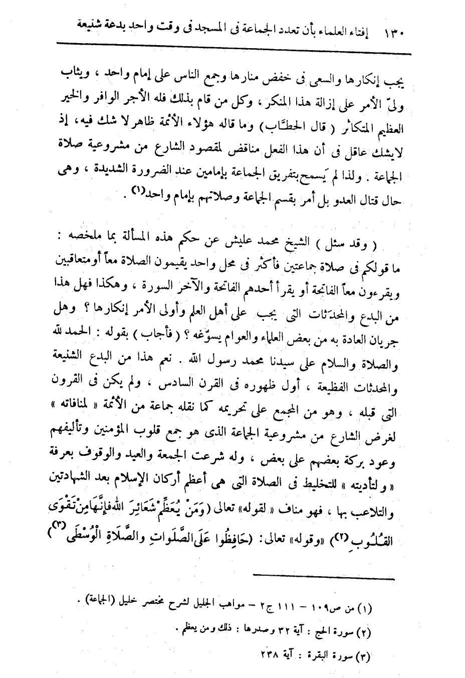 (وقد سئل) الشيخ محمد عليش عن حكم هذه المسألة بما ملخصه: ما قولكم فى صلاة جماعتين فأكثر فى محل واحد يقيمون الصلاة معاً أو متعاقبين ويقرءون معاً الفاتحة أو يقرأ أحدكم الفاتحة والآخر السورة، وهكذا فهل هذا من البدع والمحدَثات التى يجب على أهل العلم وأولى الأمر وإنكارها؟ وهل جريان العادة به من بعض العلماء والعوام يسوّغه؟ (فأجاب) بقوله: الحمد لله والصلاة والسلام على سيدنا محمد رسول الله. نعم هذا من البدع الشنيعة والمحدثات الفظيعة، أول ظهوره فى القرن السادس، ولم يكن فى القرون التى قبله، وهو من المجمع على تحريمه كما نقله جماعة من الأئمة " لمنافاته " لغرض الشارع من مشروعية الجماعة الذى هو جمع قلوب المؤمنين وتأليفهم وعود بركة بعضهم على بعض، وله شرعت الجمعة والعيد والوقوف بعرفة " ولتأديته " للتخليط فى الصلاة التى هى أعظم أركان الإسلام بعد الشهادتين والتلاعب بها، فهو مناف " لقوله " تعالى {وَمَن يُعَظِّمْ شَعَائِرَ اللَّهِ فَإِنَّهَا مِن تَقْوَى القُلُوبِ (¬2)} " وقوله " تعالى: {حَافِظُوا عَلَى الصَّلَوَاتِ وَالصَّلاةِ الوُسْطَى (¬3)}