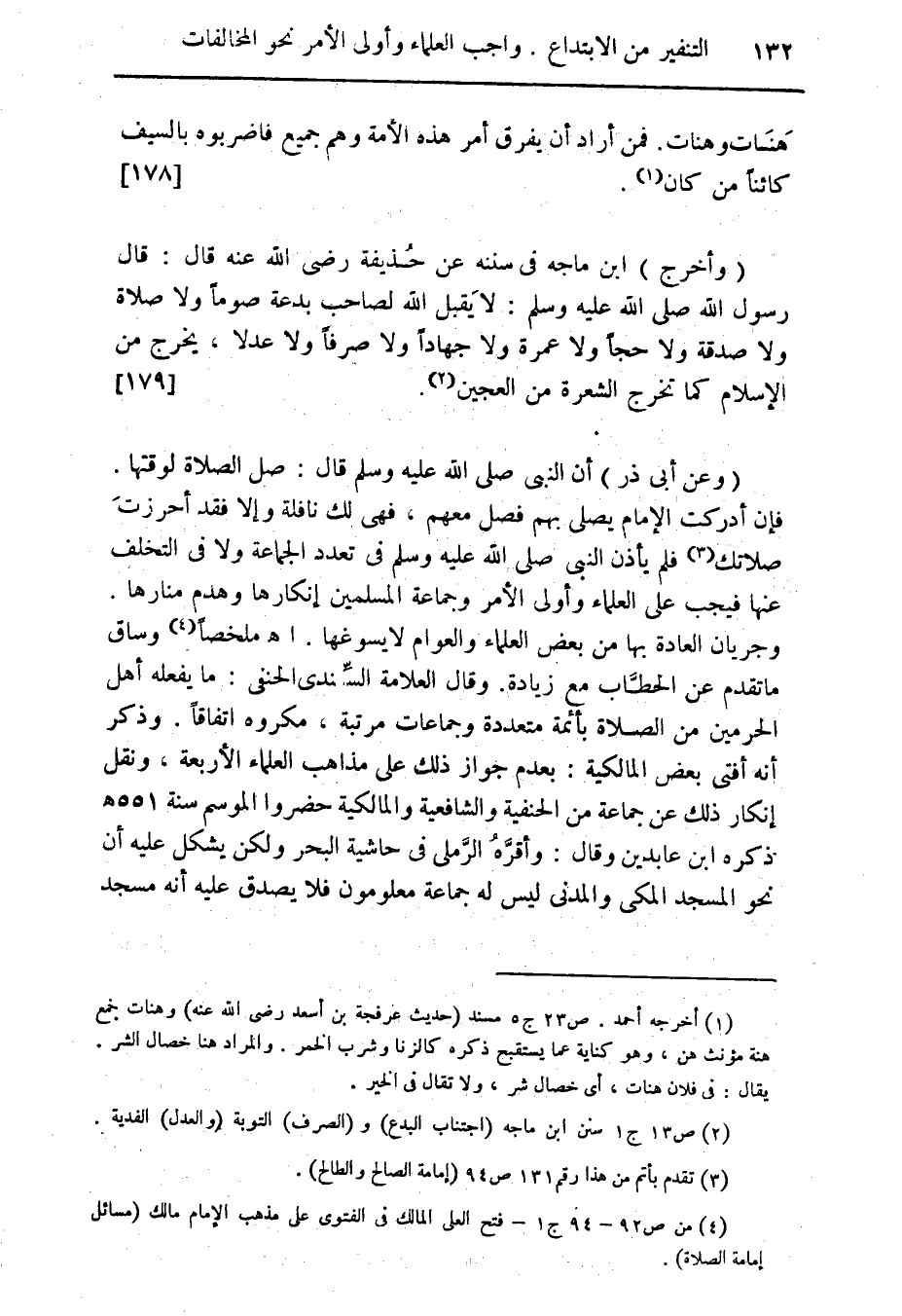 (وعن أبى ذر) أن النبى صلى الله عليه وسلم قال: صل الصلاة لوقتها. فإن أدركت الإمام يصلى بهم فصل معهم، فهى لك نافلة وإلا فقد أحرزتَ صلاتك (¬3) فلم يأذن النبى صلى الله عليه وسلم فى تعدد الجماعة ولا فى التخلف عنها فيجب على العلماء وأولى الأمر وجماعة المسلمين إنكارها وهدم منارها. وجريان العادة بها من بعض العلماء والعوام لا يسوغها. أهـ ملخصاً (¬4) وساق ما تقدم عن لحطَّاب مع زيادة. وقال العلامة السِّندى الحنفى: ما يفعله أهل الحرمين من الصلاة بأئمة متعددة وجماعات مرتبة، مكروه اتفاقاً. وذكر أنه أفتى بعض المالكية: بعدم جواز ذلك على مذاهب العلماء الأربعة، ونقل إنكار ذلك عن جماعة من الحنفية والشافعية والمالكية حضروا الموسم سنة 551 هـ ذكره ابن عابدين وقال: وأقَّرهُ الرَّملى فى حاشية البحر ولكن يشكل عليه أن نحو المسجد الملكى والمدنى ليس له جماعة معلومون فلا يصدق عليه أنه مسجد