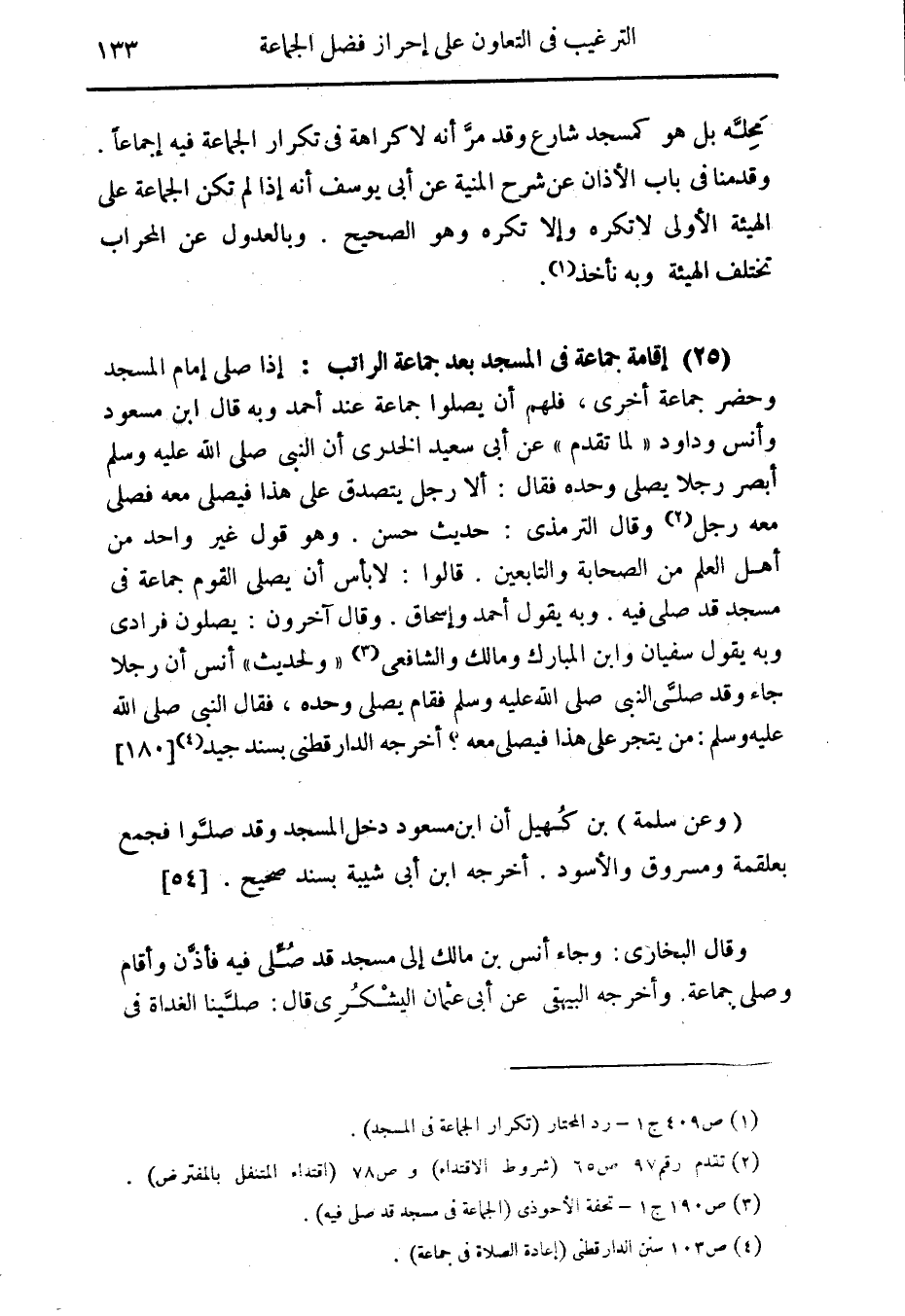 (وعن سلمة) بن كُهيل أن ابن مسعود دخل المسجد وقد صلَّوا فجمع بعلقمة ومسروق والأسود. أخرجه ابن أبى شيبة بسند صحيح. {54}