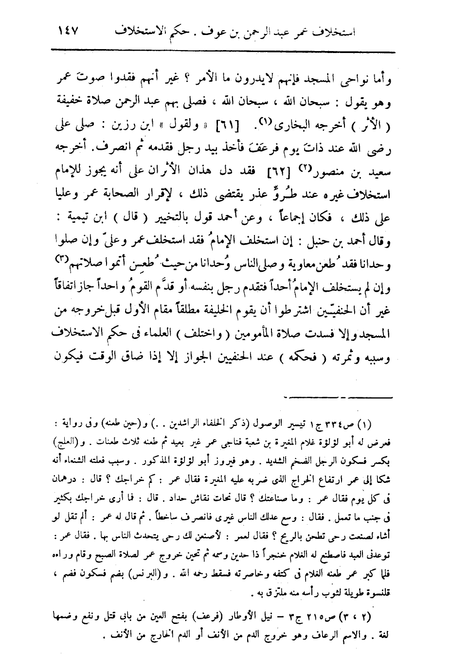 وأما نواحى المسجد فإنهم لا يدرون ما الأمر؟ غير أنهم فقدوا صوتَ عمر وهو يقول: سبحان الله، سبحان الله، فصلى بهم عبد الرحمن صلاة خفيفة (الأثر) أخرجه البخارى (¬1). {
