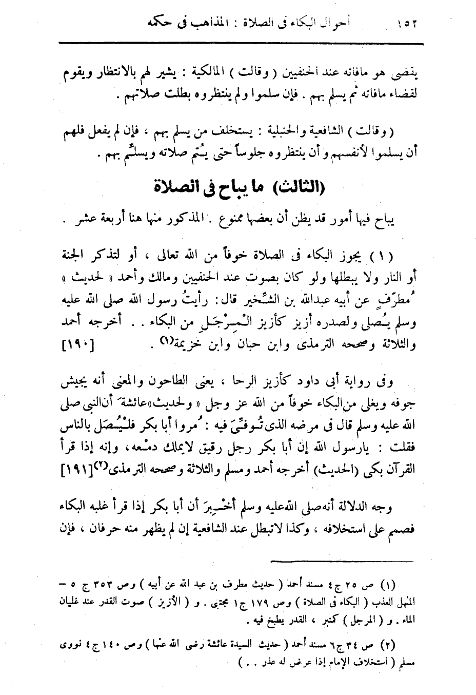 (1) يجوز البكاء فى الصلاة خوفاً من الله تعال، أو لتذكر الجنة أو النار ولا يبطلها ولو كان بصوت عند الحنفيين ومالك وأحمد " لحديث " مُطرّفٍ عن أبيه عبد الله بن الشِّخير قال: رأيتُ رسول الله صلى الله عليه وسلم يُصلى ولصدره أزيز كأزيز الْمِرْجَلِ من البكاء .. أخرجه أحمد والثلاثة وصححه الترمذى وابن حبان وابن خزيمة (¬1). {190}