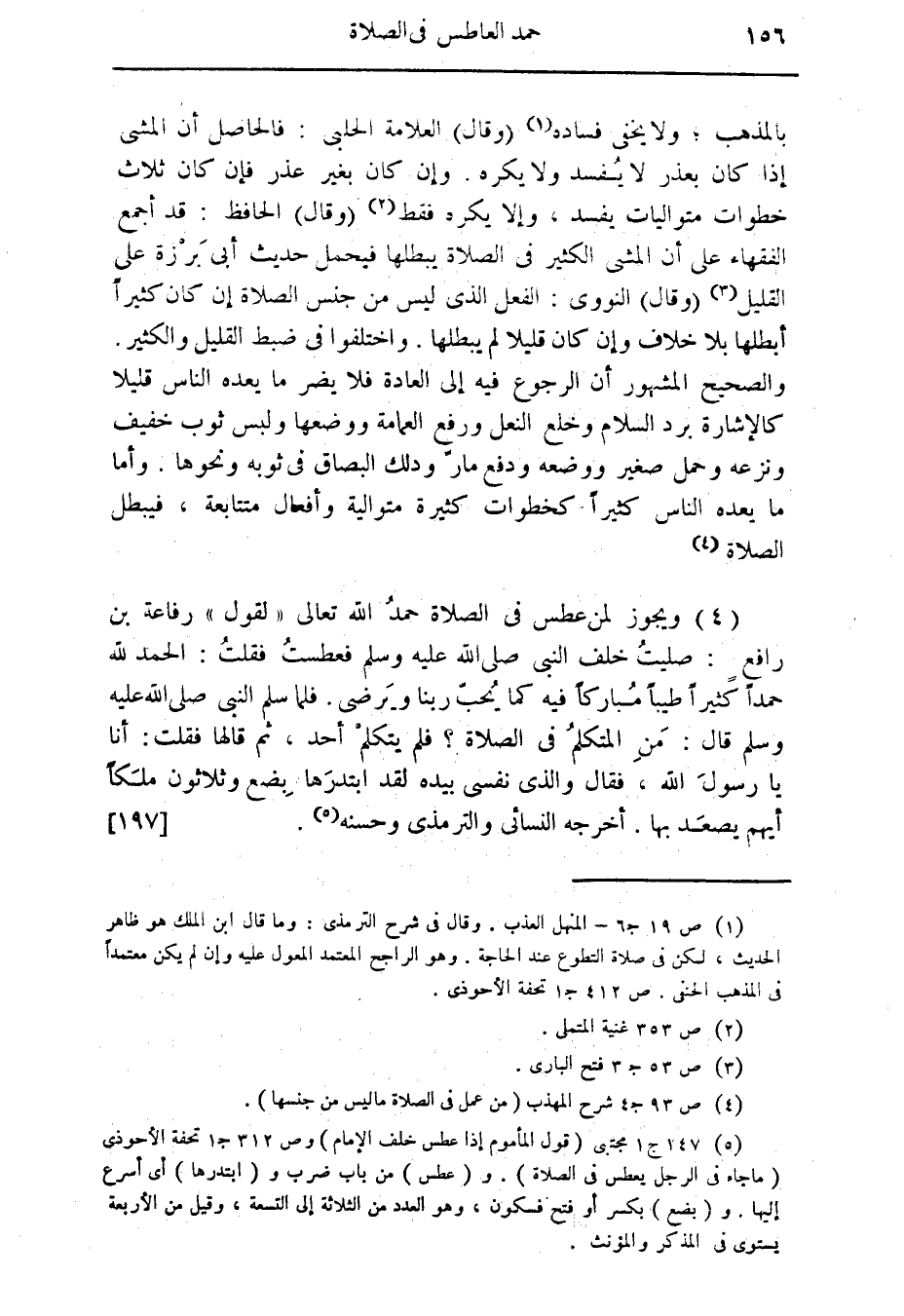 (4) ويجوز لمن عطس فى الصلاة حمدُ الله تعالى " لقول " رفاعة بن رافع: صليتُ خلف النبى صلى الله عليه وسلم فعطستُ فقلتُ: الحمد لله حمداً كثيراً طيباً مُباركاً فيه كما يُحبّ ربنا ويَرضى. فلما سلم النبى صلى الله عليه وسلم قال: مَنِ المتكلمُ فى الصلاة؟ فلم يتكلمْ أحد، ثم قالها فقلت: أنا يا رسولَ الله، فقال والذى نفسى بيده لقد ابتدرَها بِضع وثلاثون ملَكاً أيهم يصعَد بها. أخرجه النسائى والترمذى وحسنه (¬5). {197}