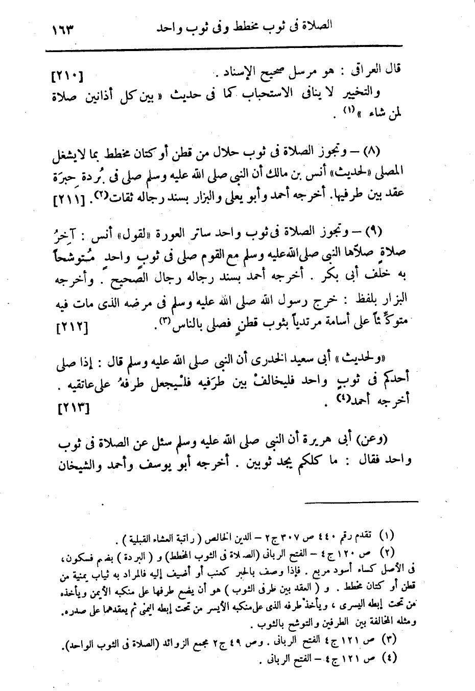 (8) - وتجوز الصلاة فى ثوب حلال من قطن أو كتان مخطط بما لا يشغل المصلى " لحديث " أنس بن مالك أن النبى صلى الله عليه وسلم صلى فى بُردة حِبرَة عقد بين طرفيها. أخرجه أحمد وأبو يعلى والبزار بسند رجاله ثقات (¬2). {211}