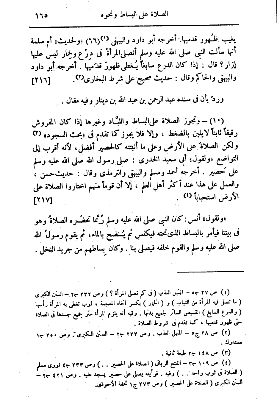 (10) - وتجوز الصلاة على البساط واللبَّاد وغيرها إذا كان المفروش رقيقاً ثابتاً لا يلين بالضغط، وإلا فلا يجوز كما تقدم فى " بحث السجود " (¬3) ولكن الصلاةَ على الأرض وعلى ما أنبتته كالحصير أفضل، لأنه أقرب على التواضع " ولقول " أبى سعيد الخدرى: صلى رسول الله صلى الله عليه وسلم على حَصير. أخرجه أحمد ومسلم والبيهقى والترمذى وقال: حديث حسن، والعمل على هذا عند أكثر أهل العلم، إلا أن قوماً منهم اختاروا الصلاة على الأرض استحباباً (¬4). {217}