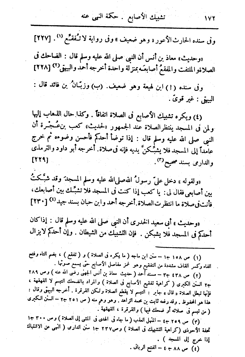 " ولقوله " دخل علىّ رسولُ الله صلى الله عليه وسلم المسجدَ وقد شبَّكتُ بين أصابعى فقال لى: يا كعب إذا كنت فى المسجد فلا تشبِّك بين أصابعك، فأنت فى صلاة ما انتظرت الصلاة. أخرجه أحمد وابن حبان بسند جيد (¬4). {230}