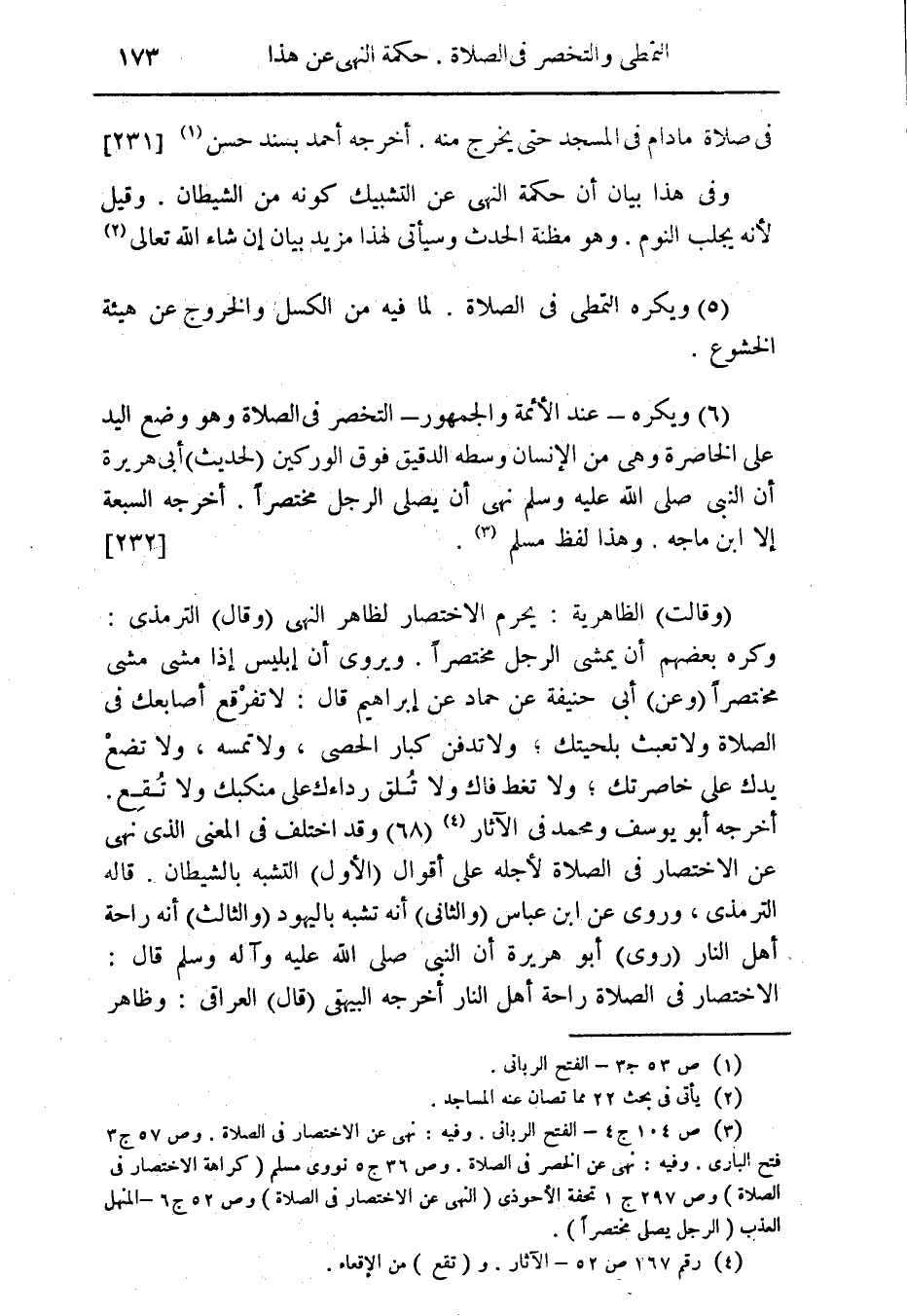 (¬3) ص 104 ج 4 - الفتح الربانى. وفيه: نهى عن الاختصار فى الصلاة. وص 57 ج 3 فتح البارى. وفيه: نهى عن الخصر فى لاصلاة. وص 36 ج 5 نووى مسلم (كراهة الاختصار فى الصلاة) وص 297 ج 1 تحفة الأحوذى (النهى عن الاختصار فى الصلاة) وص 52 ج 6 - النهل العذب (الرجل يصلى مختصراً).